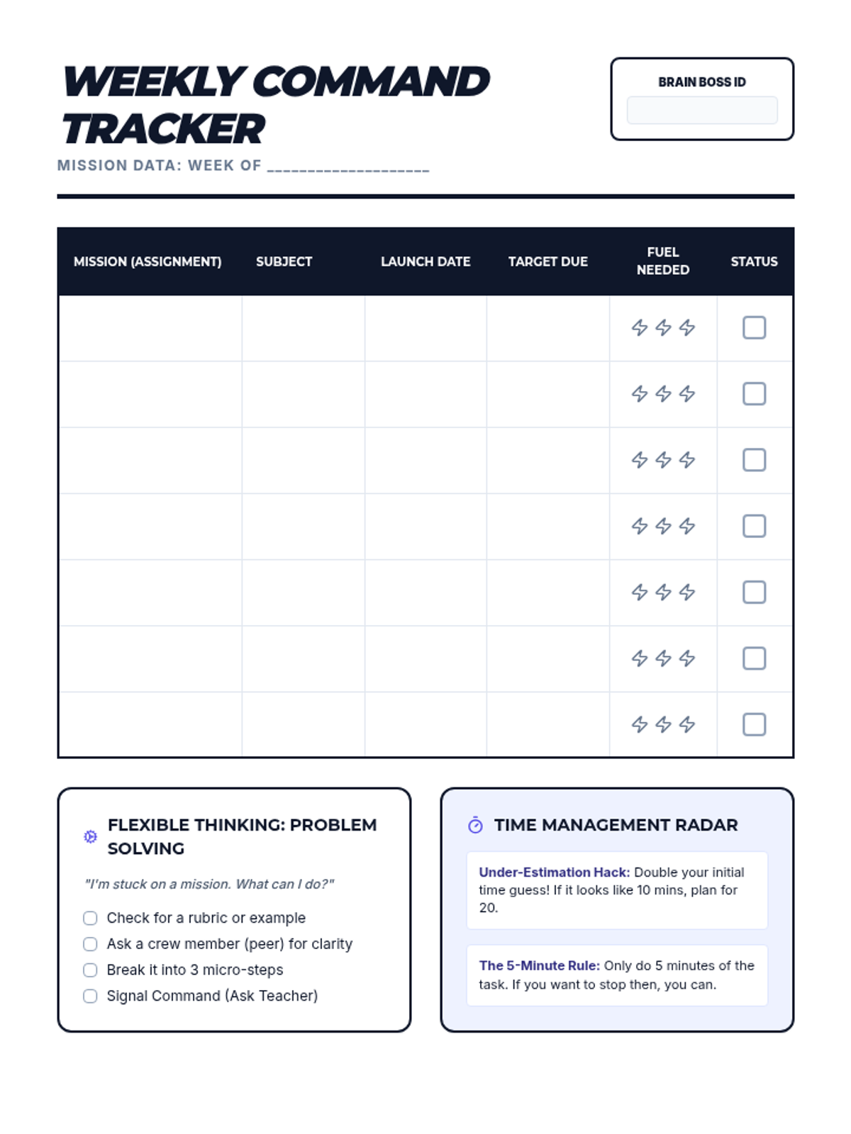 A weekly assignment tracker for middle schoolers that emphasizes time estimation, start dates, and problem-solving strategies. Includes a "Fuel Needed" scale for effort estimation and flexible thinking tips.