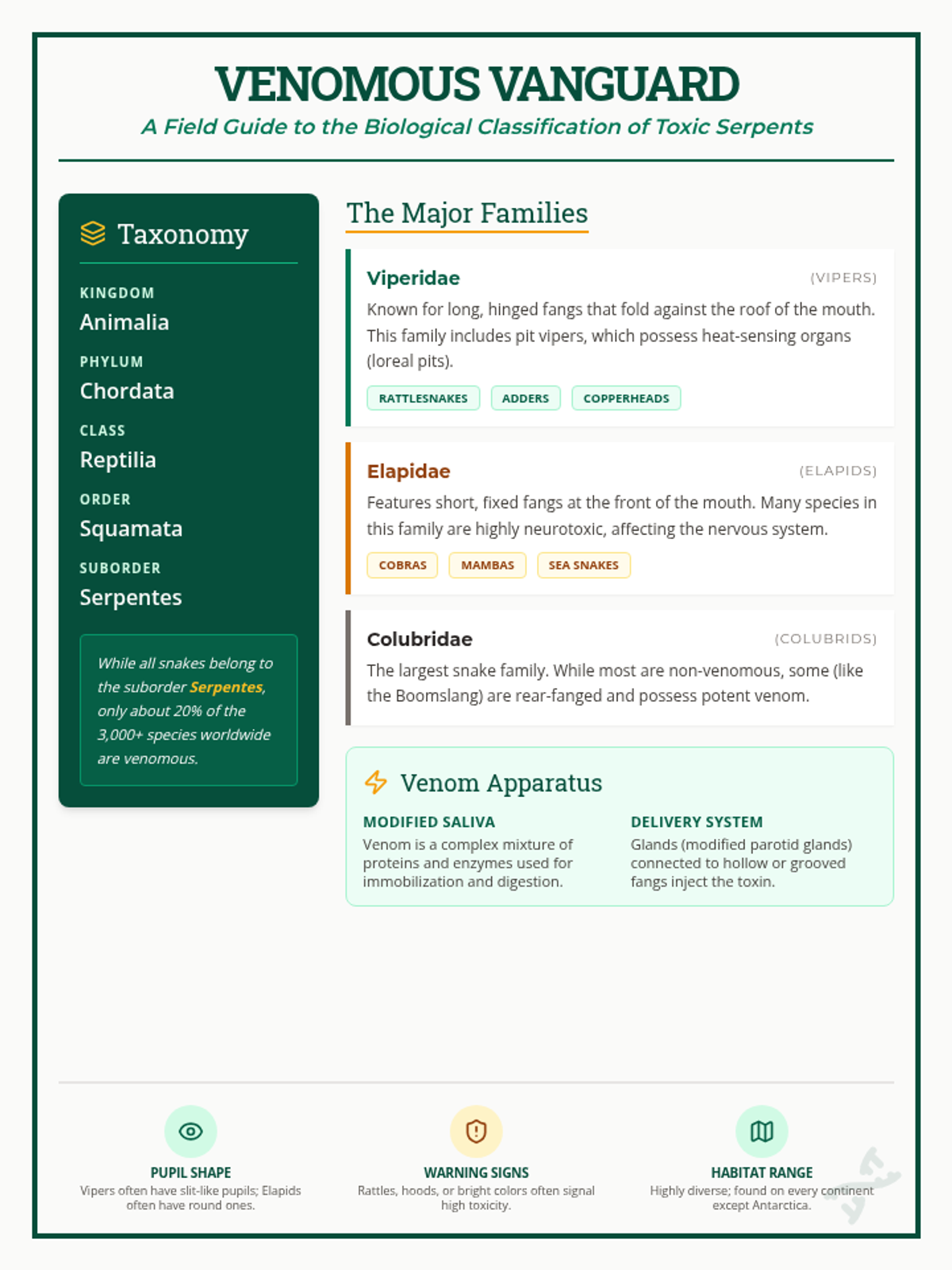 A comprehensive fact sheet poster detailing the biological classification of venomous snakes, highlighting the differences between major families like Viperidae and Elapidae with a professional field-guide aesthetic.
