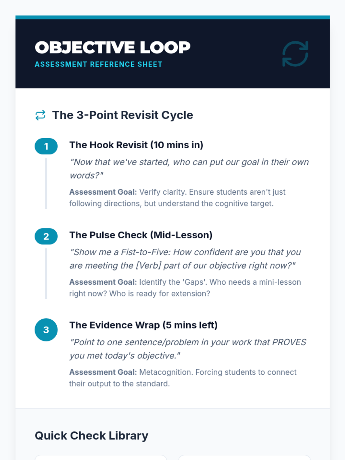 A practical reference sheet for teachers detailing the 3-point revisit cycle and a library of quick formative assessment techniques to use during lessons.
