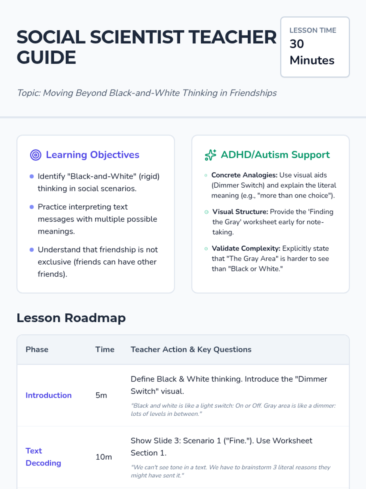 A comprehensive teacher's guide for a 30-minute lesson on social-emotional learning, specifically designed for students with ADHD and Autism. It includes learning objectives, ADHD-specific support strategies, a detailed pacing guide, and helpful scripts for managing rigid thinking.