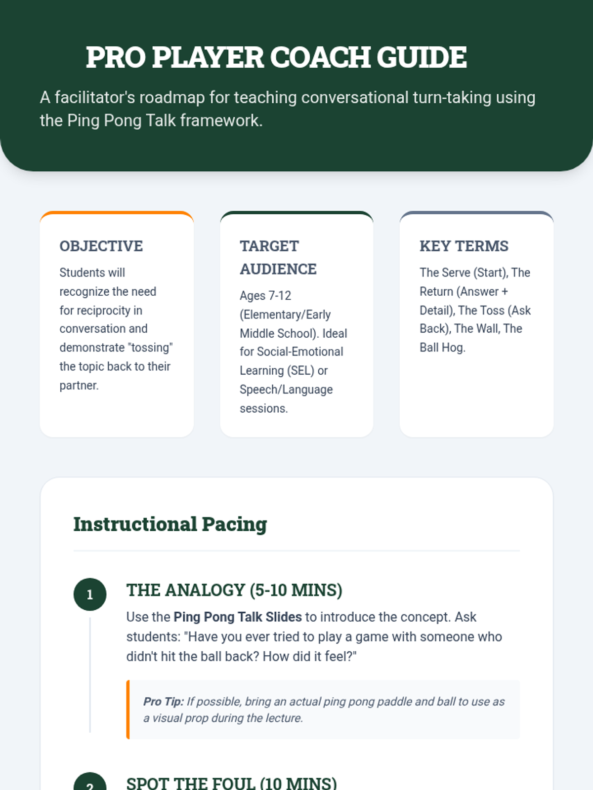 A comprehensive teacher guide for facilitating the 'Ping Pong Talk' lesson. Includes objectives, step-by-step instructions for slides and worksheets, and troubleshooting tips for common student mistakes.