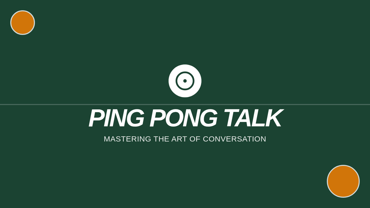A visual presentation teaching the 'ping pong' analogy for conversation, covering starting a dialogue, responding with detail, and asking questions back. Includes 'foul' examples like the 'Wall' and the 'Ball Hog'.