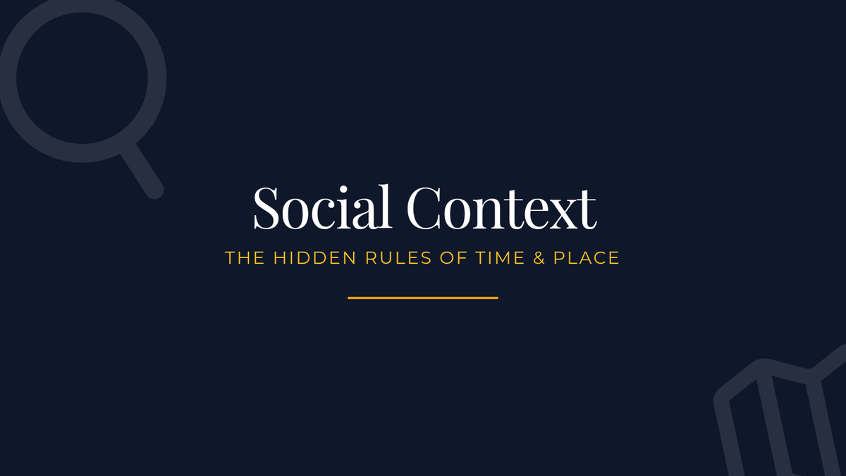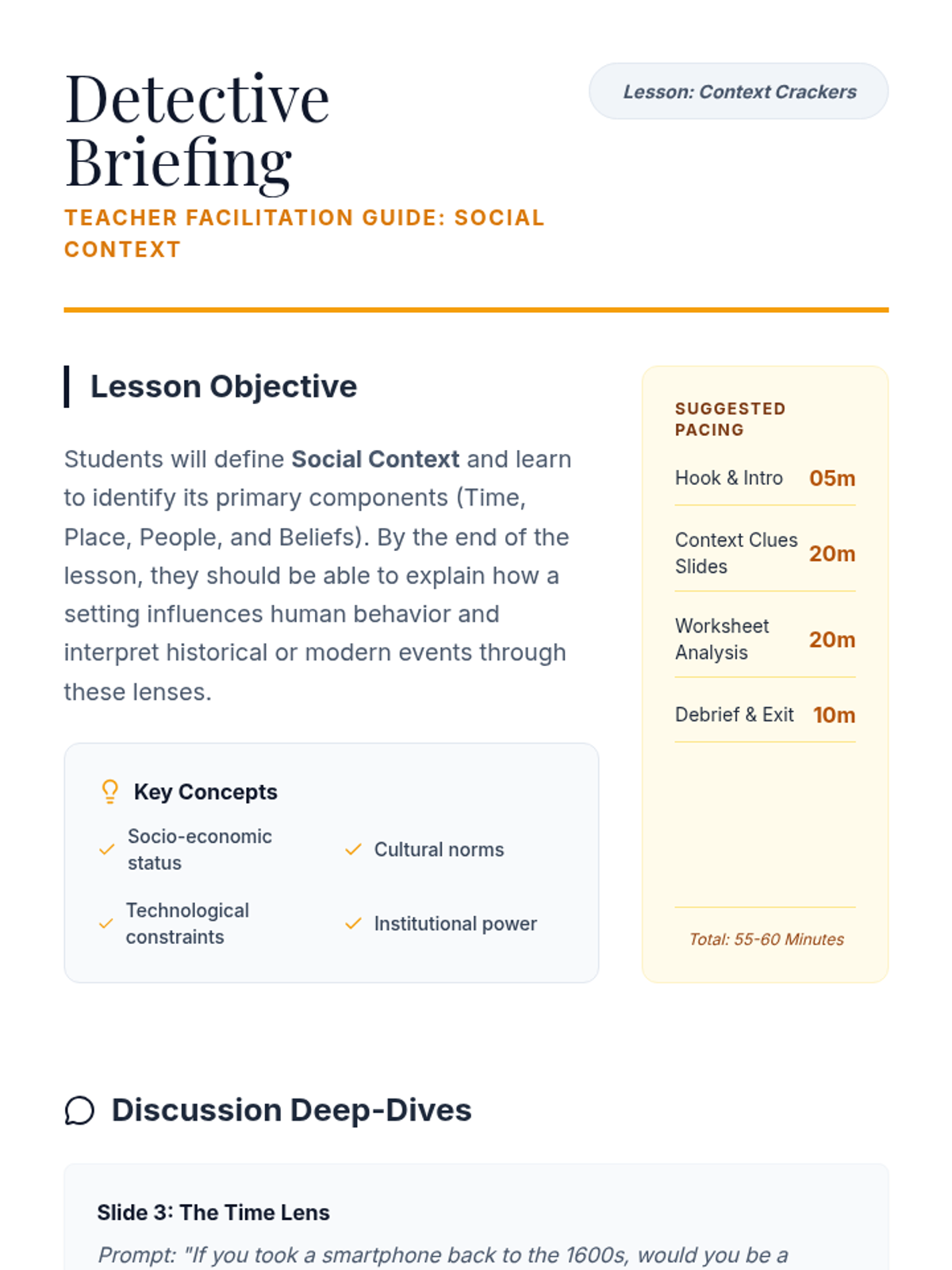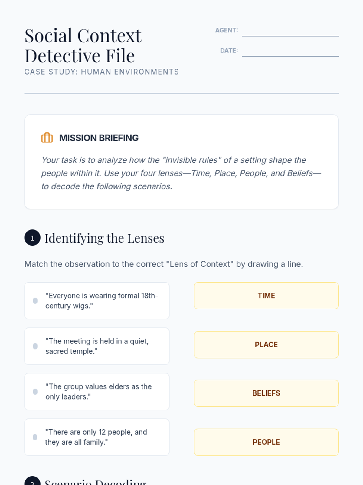 A visually engaging slide deck that introduces the concept of social context through a 'detective' lens. It covers the four pillars (People, Place, Time, Beliefs) and provides historical and modern case studies for student analysis.