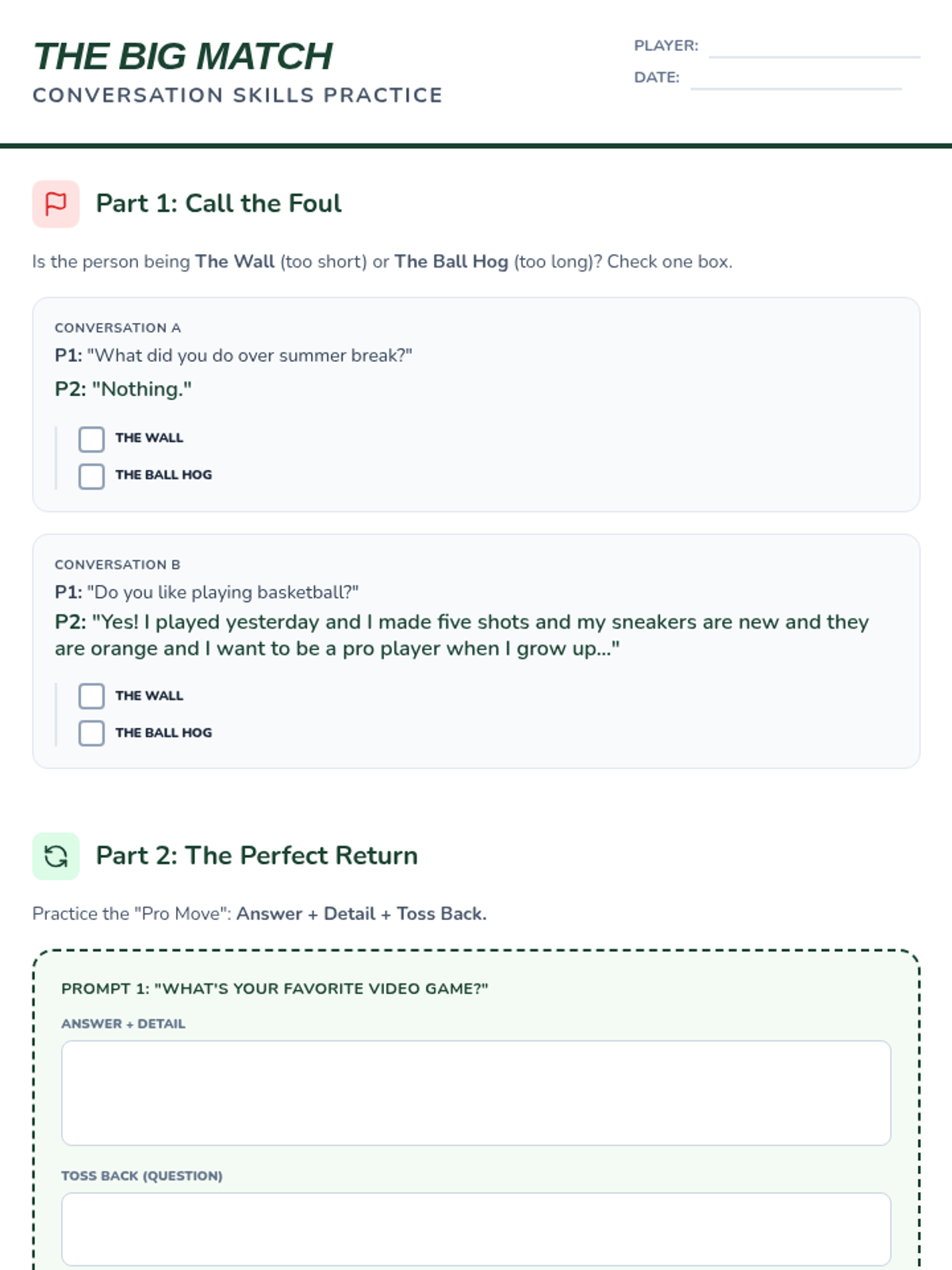 A practice worksheet for students to identify conversational 'fouls' (The Wall and The Ball Hog) and practice the 'Answer + Detail + Toss' technique for better dialogue flow.