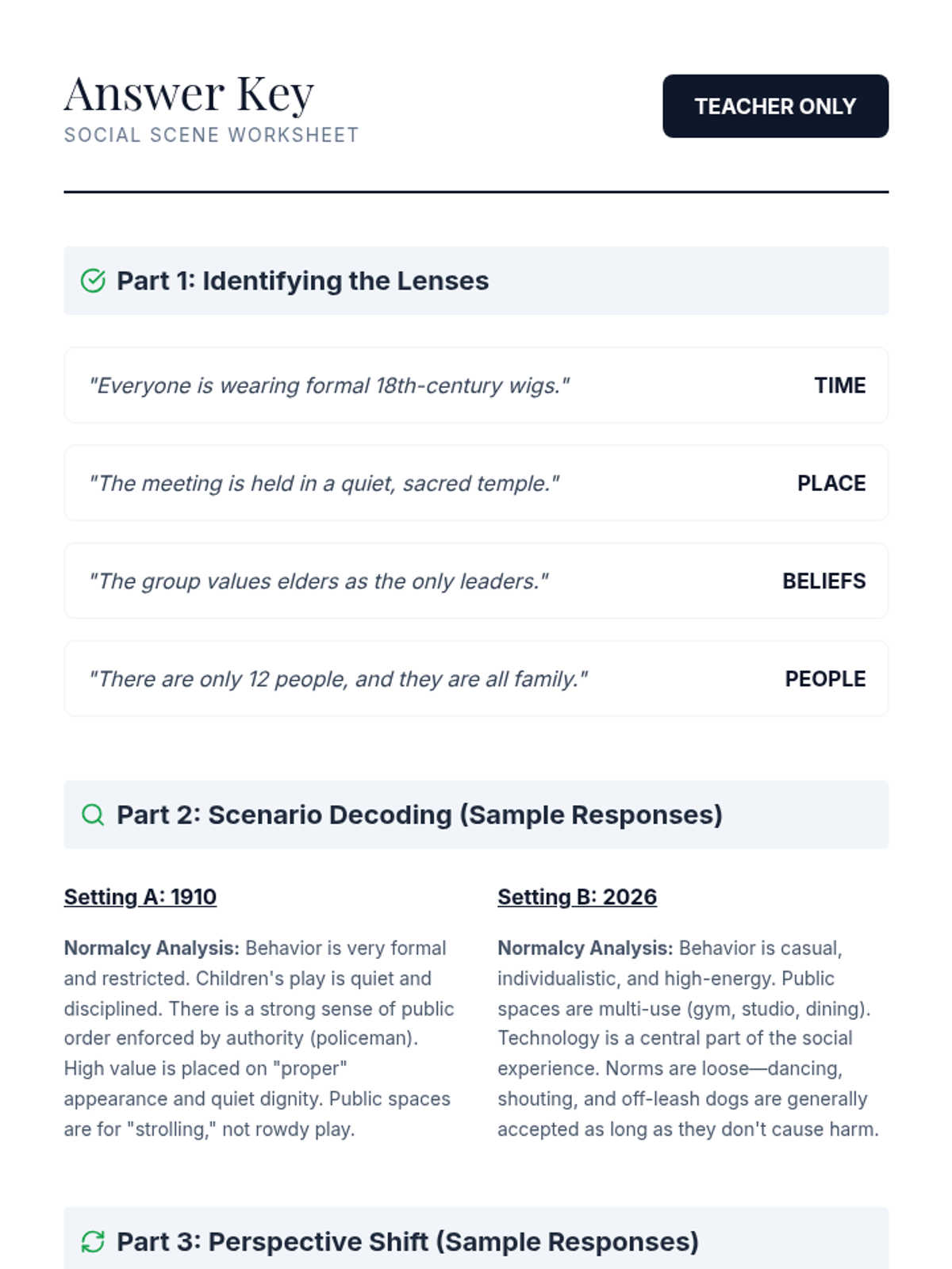 A teacher answer key for the Social Scene Worksheet. Revised for improved visual formatting of the scoring guide.