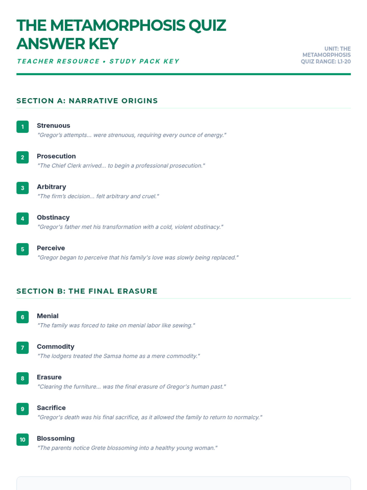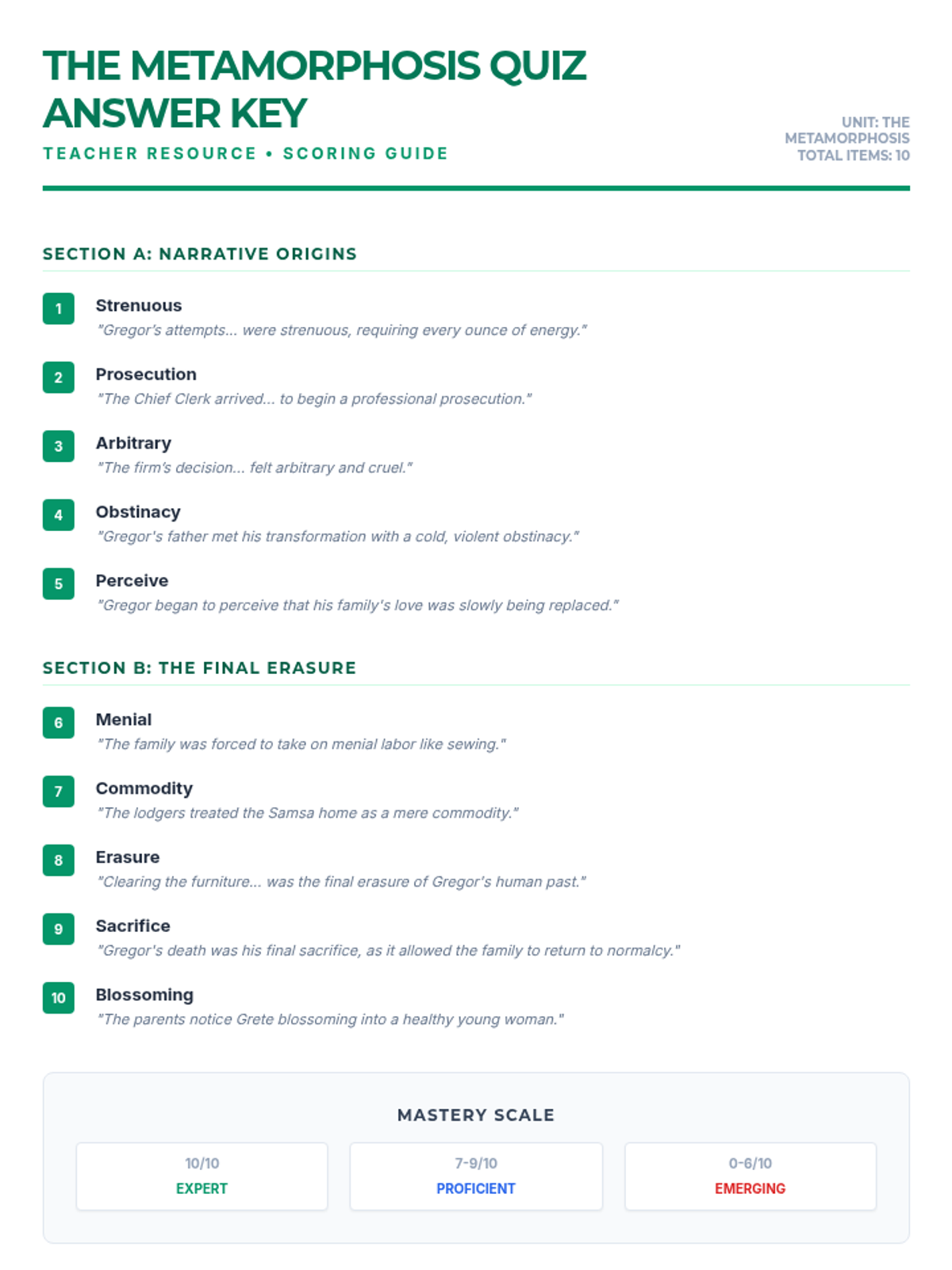 Teacher answer key for the unit-wide Vocabulary Mastery Quiz. Provides correct answers, full context sentences, and a suggested grading scale for the 10-item assessment included in the study pack. Includes a brief reference list of unit vocabulary. Optimized for print with 'break-inside: avoid' on the scale.