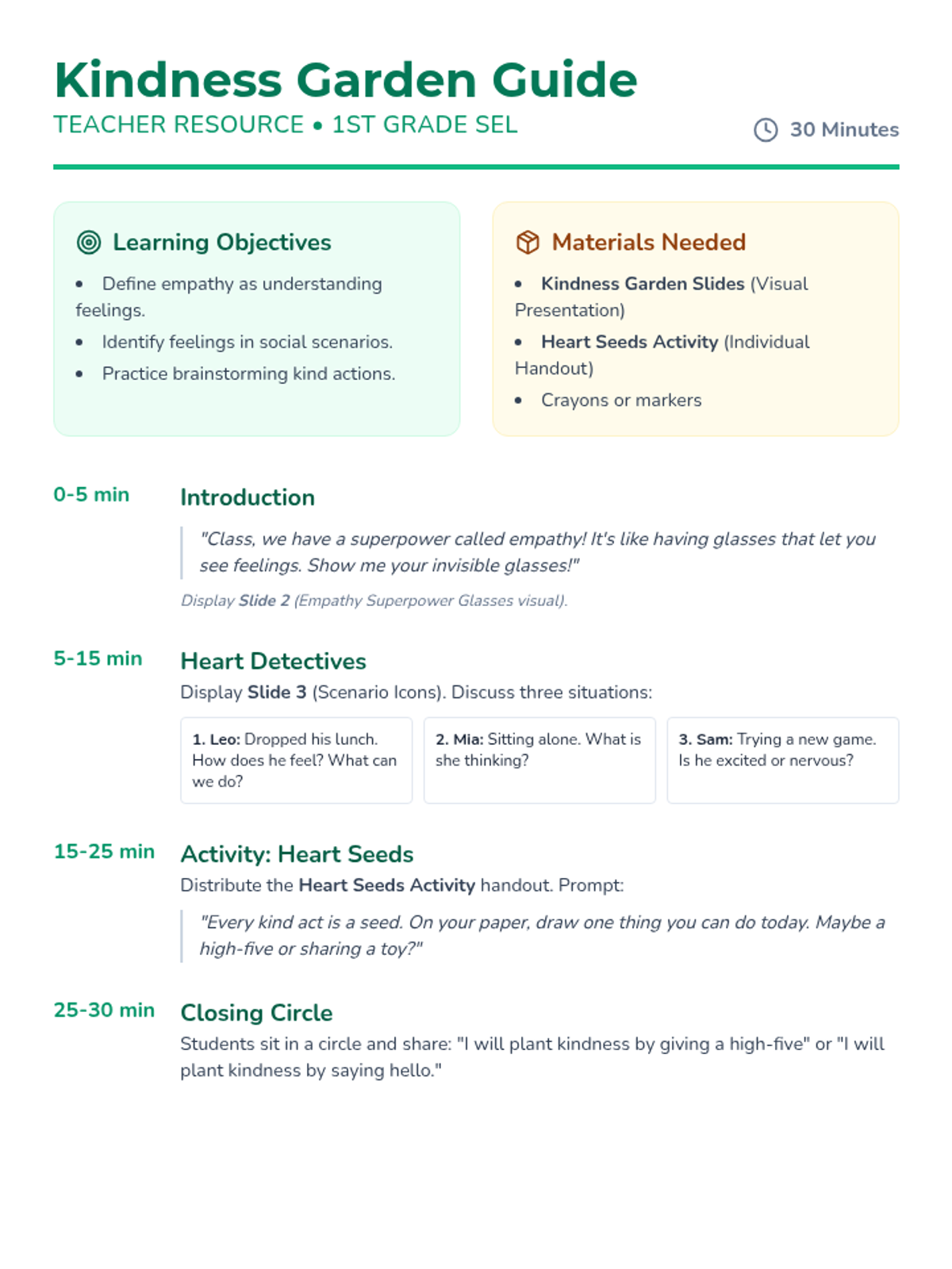 A vibrant and engaging slide deck for a 1st-grade SEL lesson on kindness and empathy, featuring clear visuals, discussion prompts, and a "Heart Seeds" activity introduction.