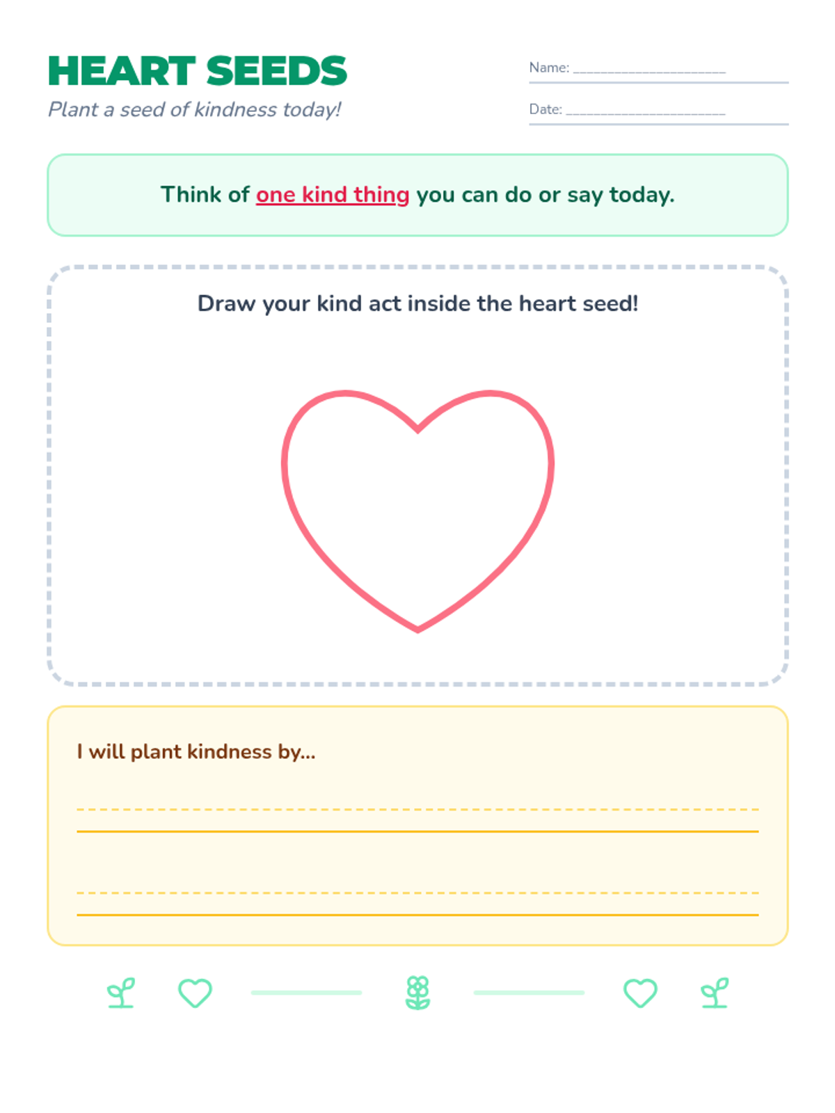 A student-facing activity sheet where 1st graders draw and write about a specific act of kindness they plan to perform, using a garden-themed heart-seed metaphor.