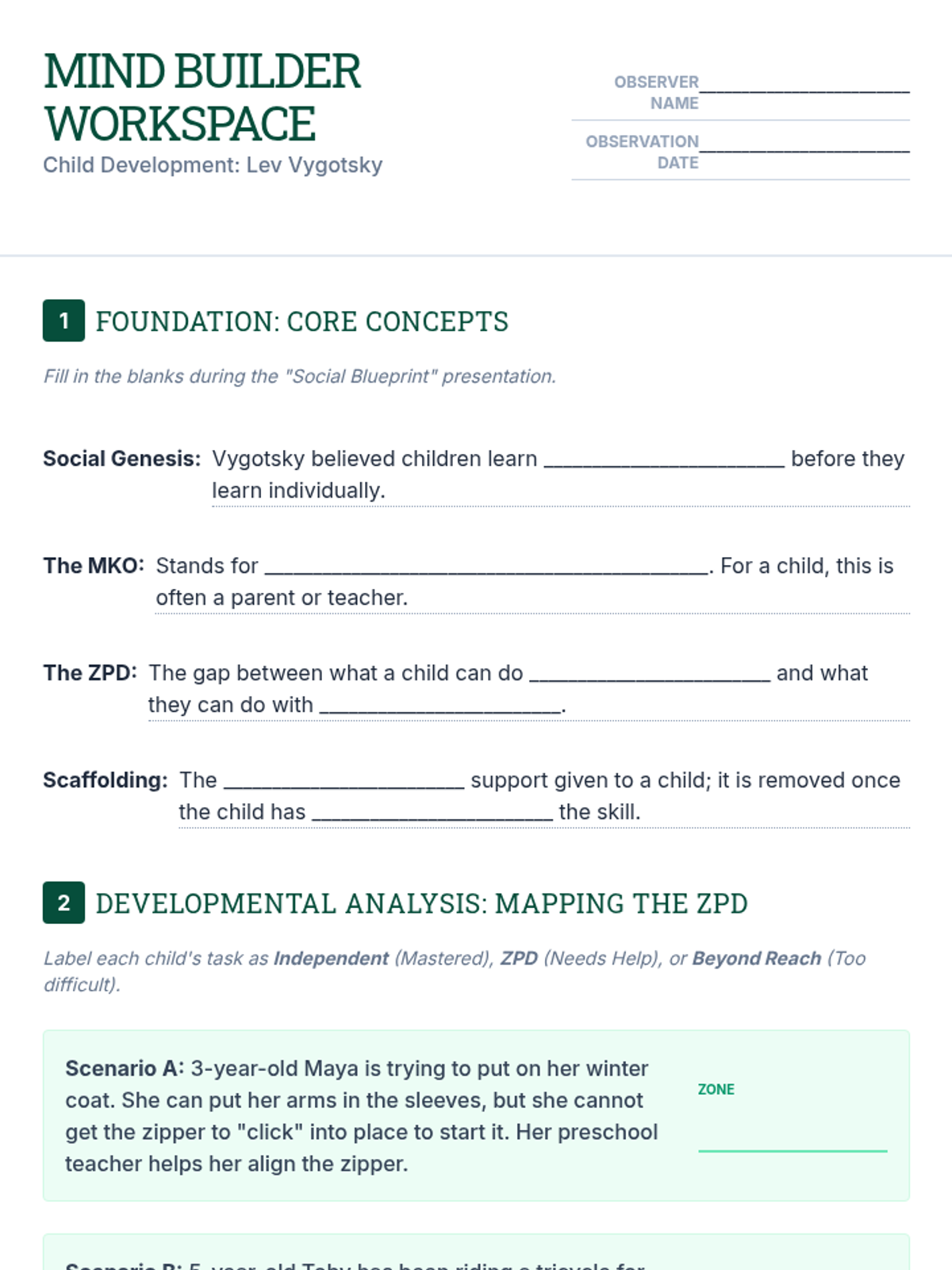 A 2-page student worksheet for guided note-taking, child development scenario analysis, and a creative scaffolding design task for a developmental milestone.
