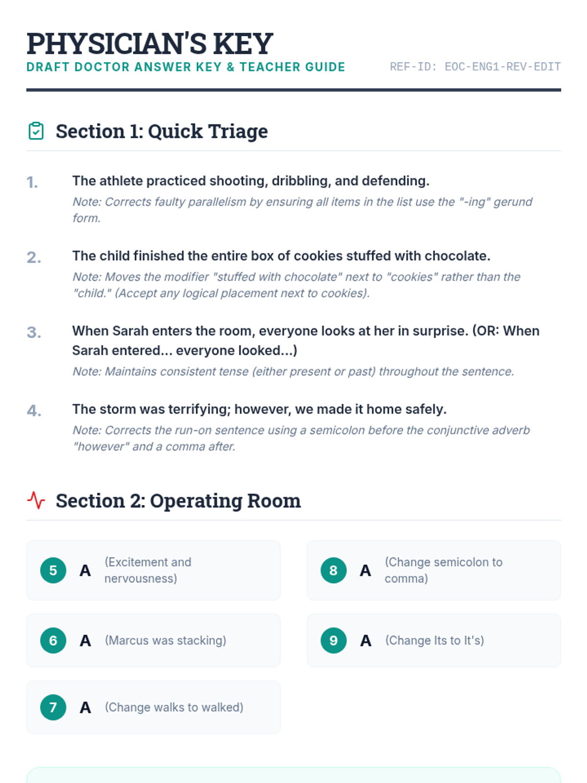 A medical-themed slide deck for English 1 EOC revising and editing, covering parallelism, verb tense, punctuation, and paragraph organization with clear examples and guided practice.