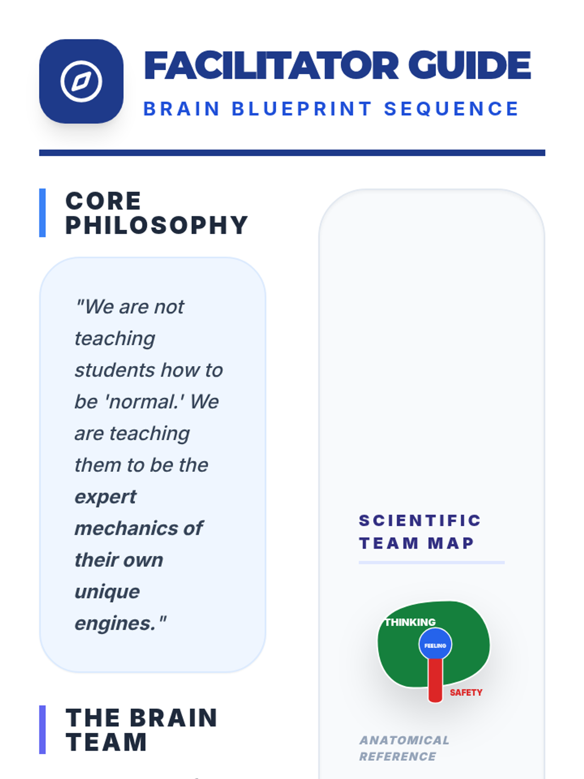 A comprehensive teaching guide for facilitating the Brain Blueprint sequence, providing core philosophies, lesson pacing, key concepts, and neuro-affirming facilitation tips.