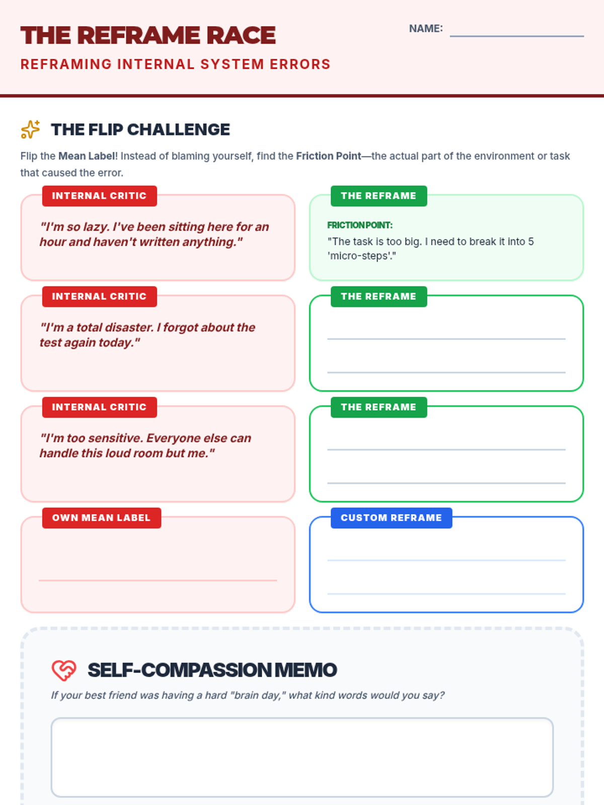 A resilience-building worksheet where students practice reframing self-critical labels (like 'lazy' or 'sensitive') into objective problem-solving statements focused on executive function and sensory needs.
