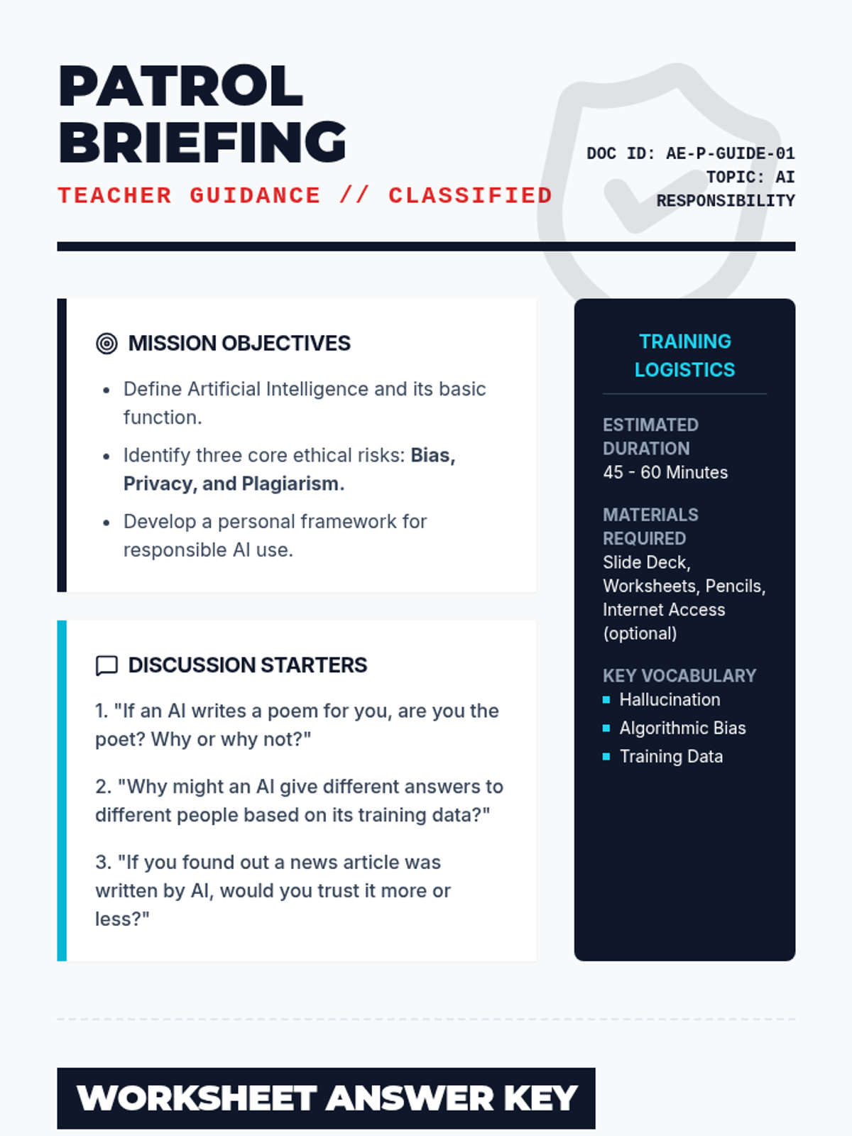 A detailed teacher-facing guide for the "Ethics Patrol" lesson. Includes lesson objectives, discussion prompts, a worksheet answer key, and strategic teaching tips for addressing AI responsibility.