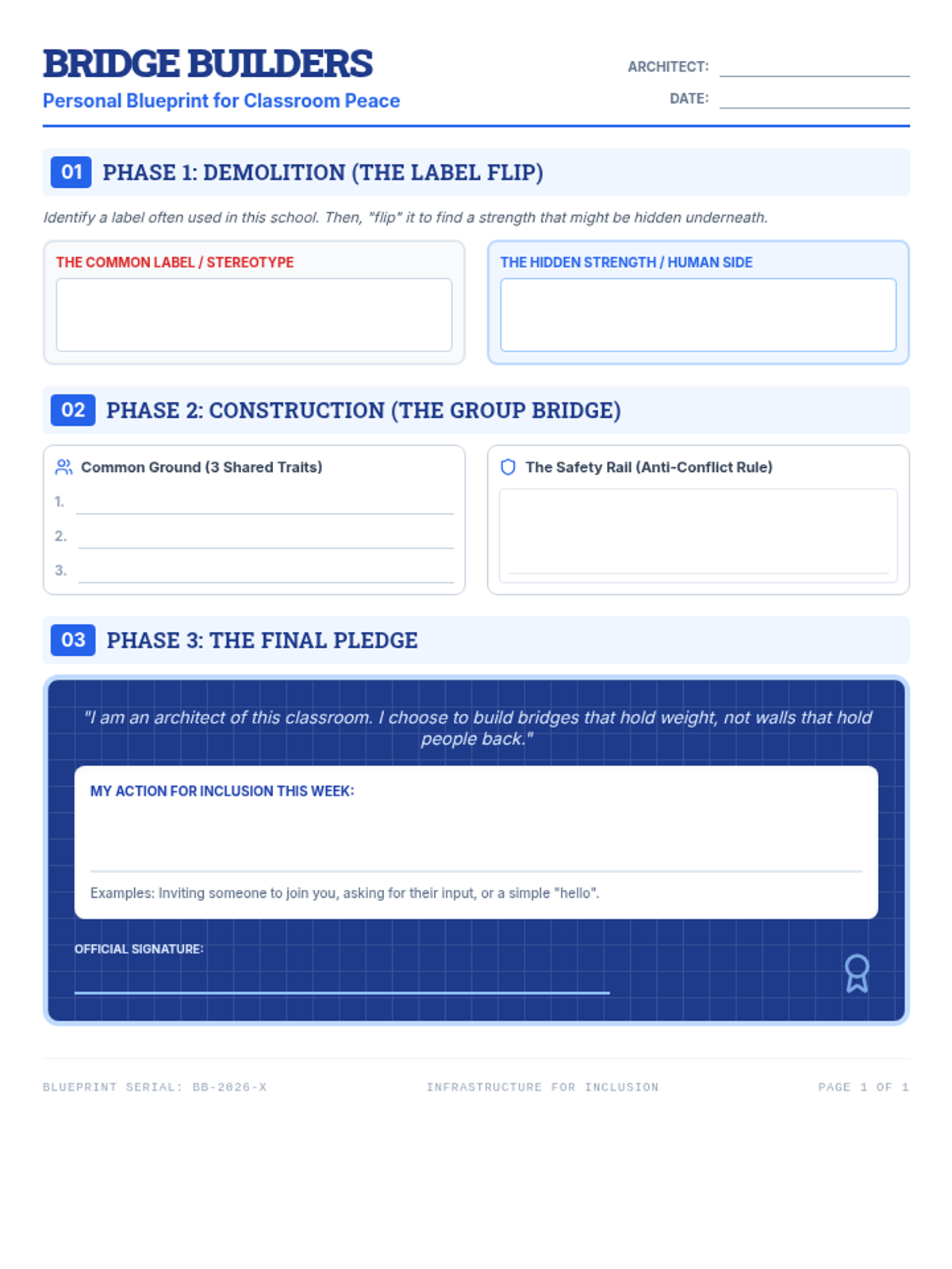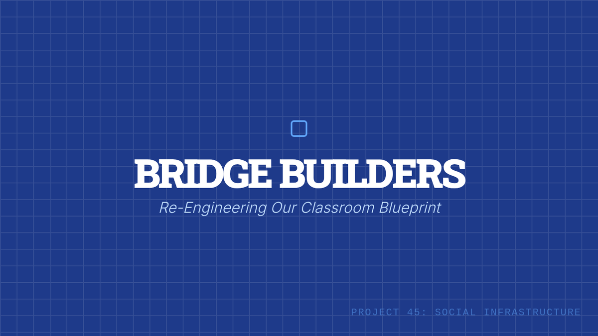 A 45-minute slide deck for the 'Bridge Builders' workshop, using an architectural blueprint theme to discuss social barriers, cliques, and empathy.