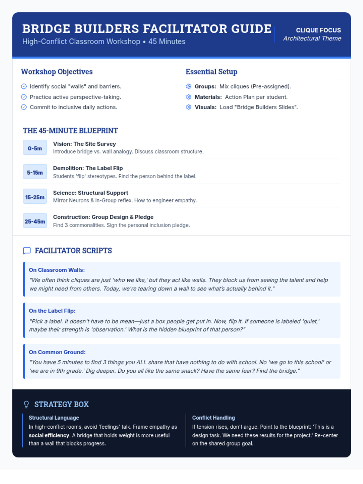 A facilitation guide for teachers to lead the 'Bridge Builders' workshop, including a minute-by-minute breakdown, scripted prompts, and strategies for managing high-conflict classroom dynamics.