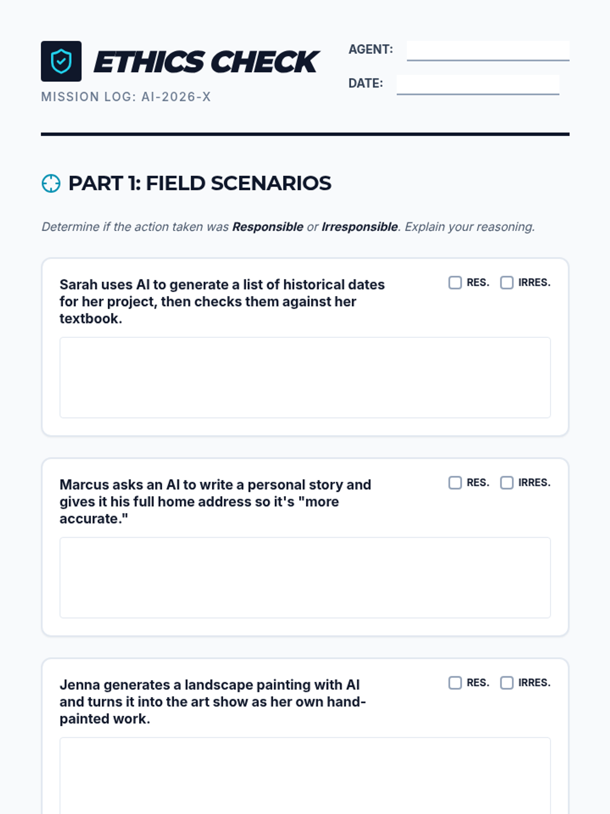 A student-facing worksheet where they analyze real-world AI use cases, identify privacy risks, and design their own ethical AI solution. Includes a signature section for the "Ethics Patrol Pledge".