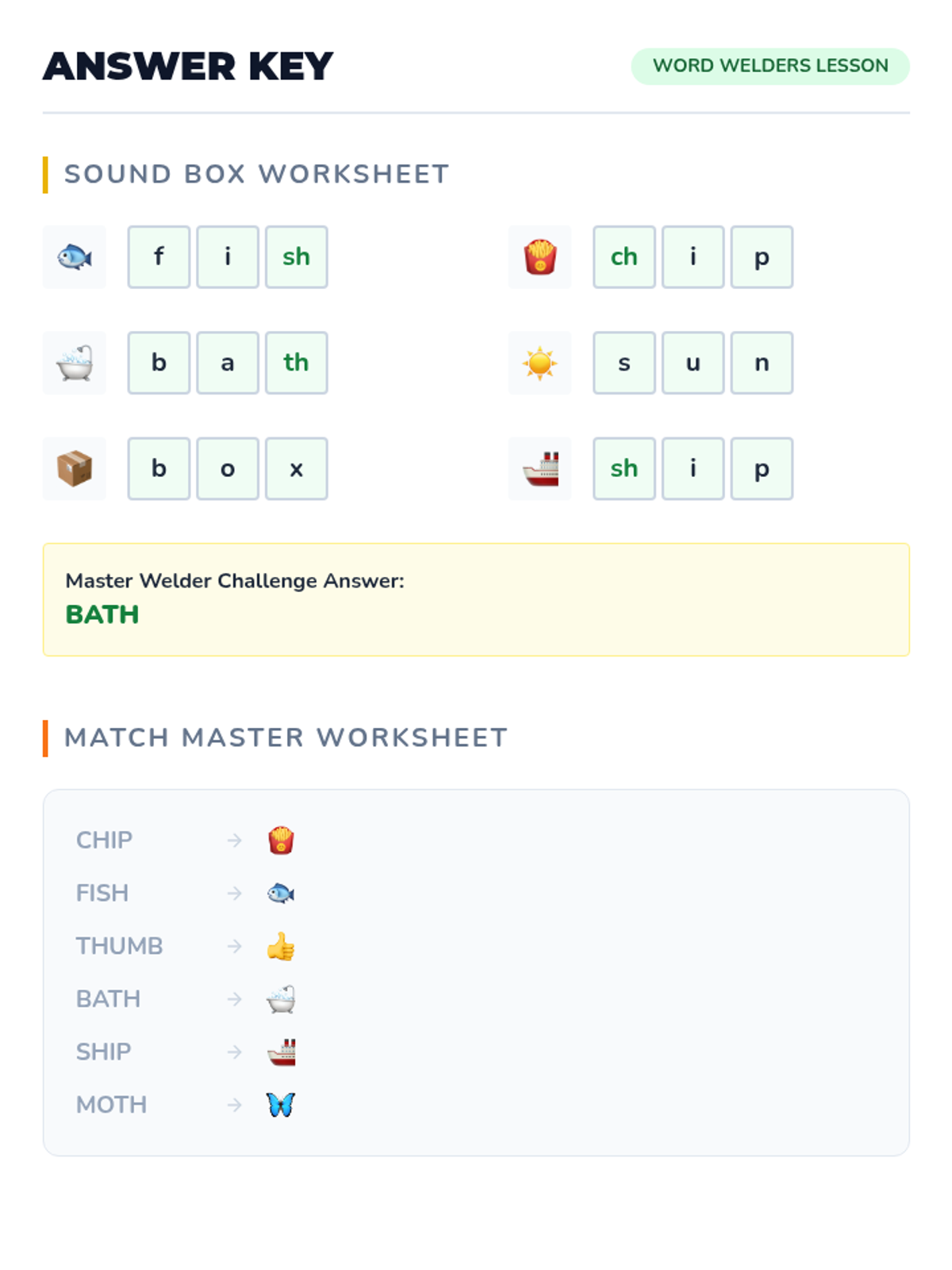 The complete answer key for the Sound Box and Match Master worksheets, including phoneme breakdowns for the sound boxes.