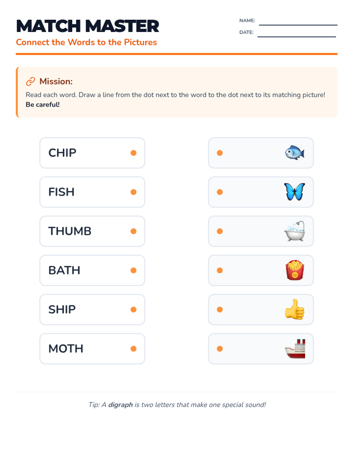 A matching worksheet where students connect words containing short vowels and digraphs to their corresponding emoji-style illustrations.