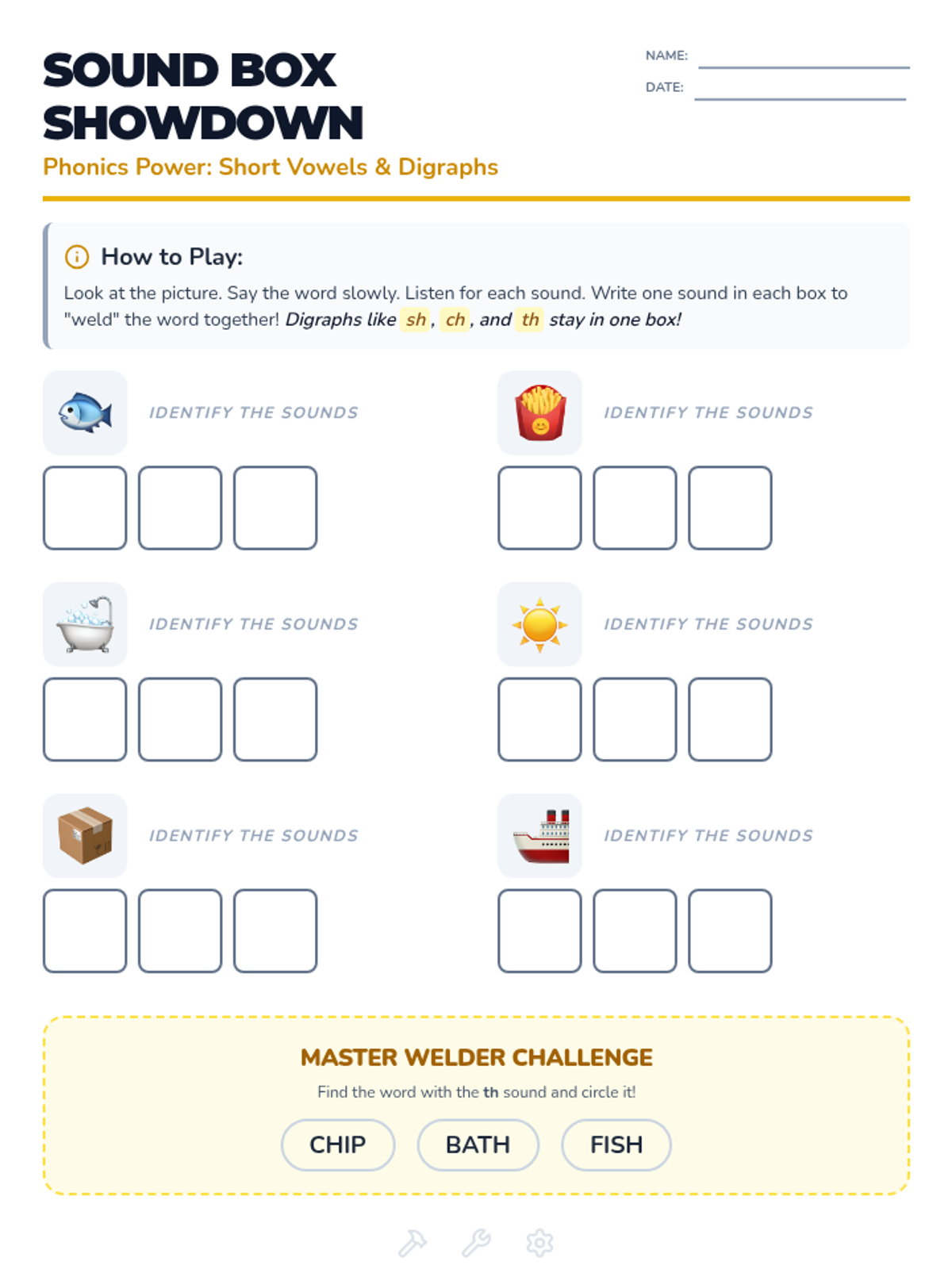 A worksheet featuring Elkonin boxes (sound boxes) for students to practice phoneme segmentation and blending of words with short vowels and digraphs.