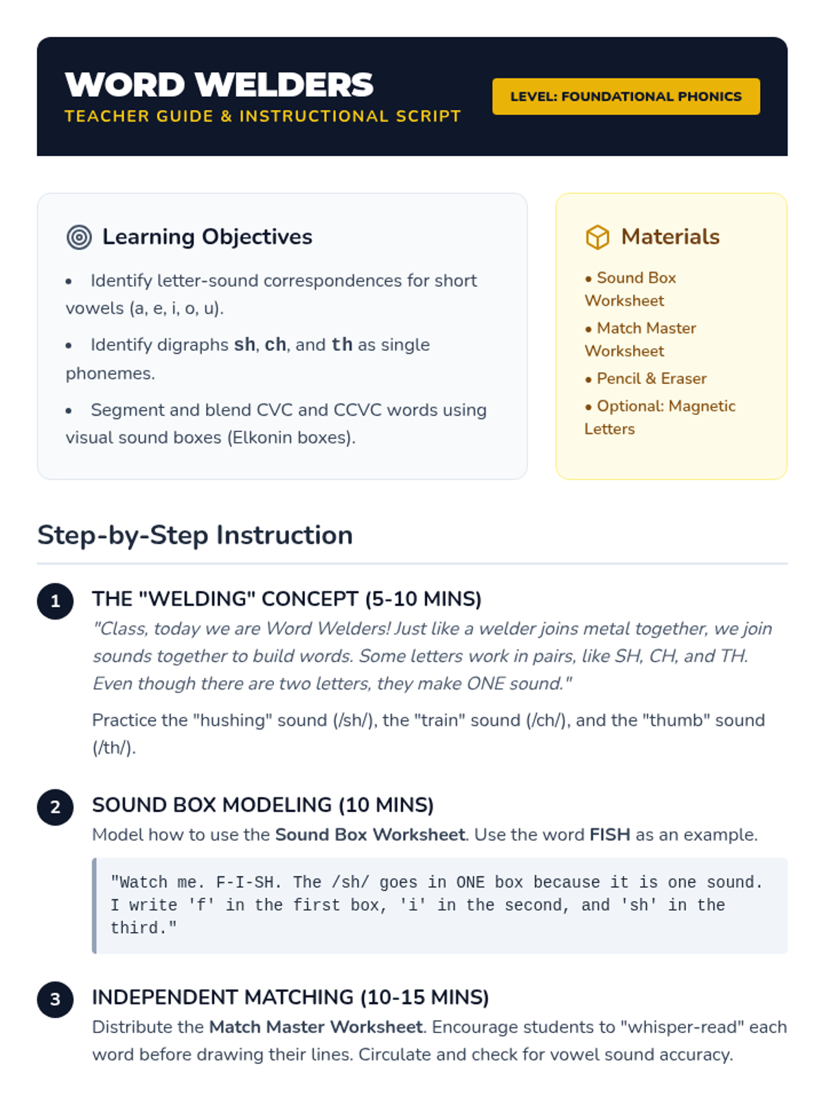 A comprehensive teacher guide for the 'Word Welders' lesson, including instructional scripts, learning objectives, and troubleshooting tips for teaching short vowels and digraphs.