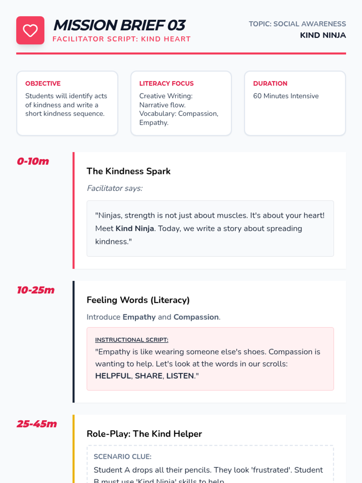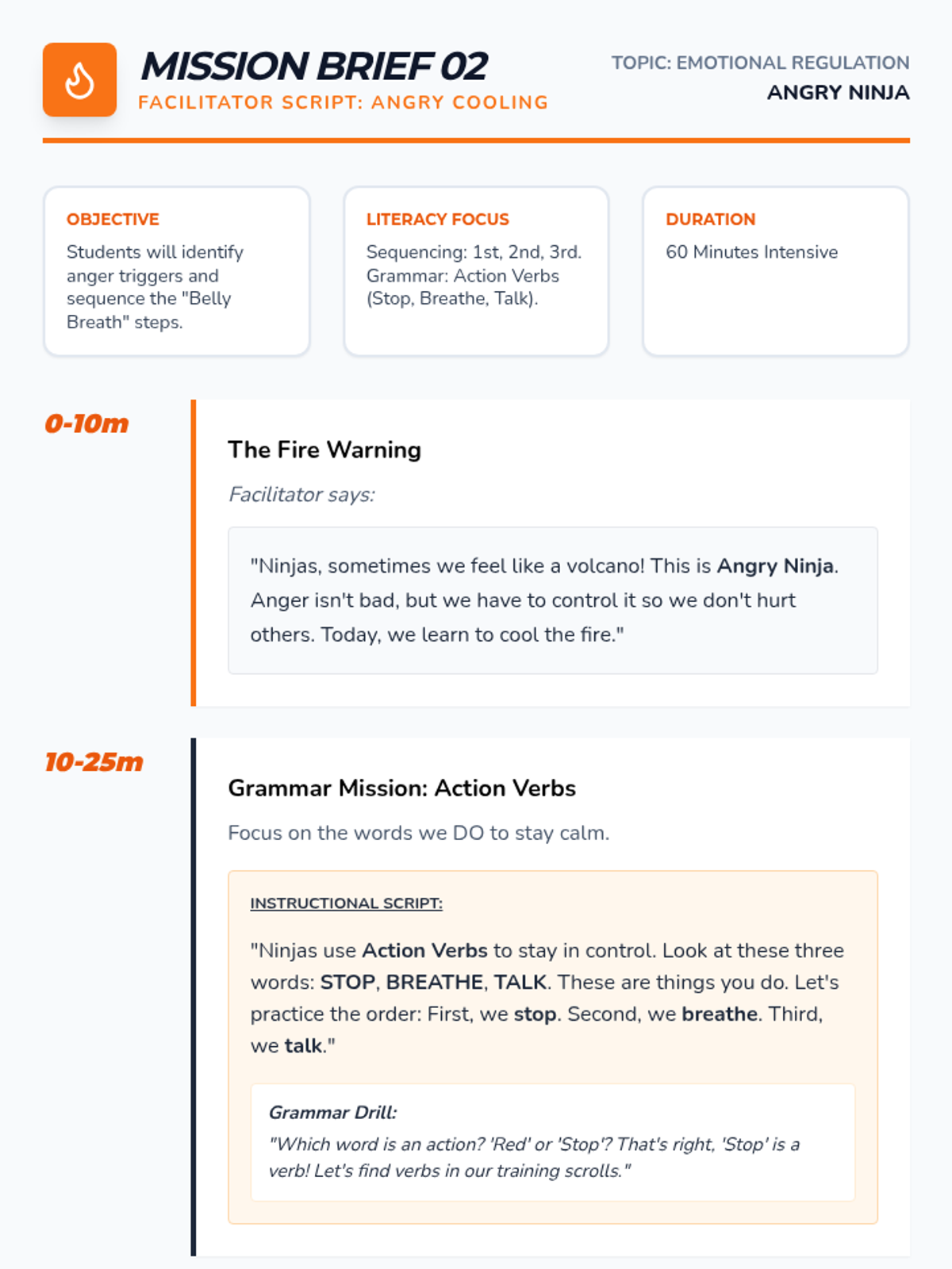 A detailed facilitator script for Lesson 2, focusing on Angry Ninja and emotional regulation. Includes sequencing strategies, role-play scenarios, and cooling techniques. Revised for grammar integration and page break stability.