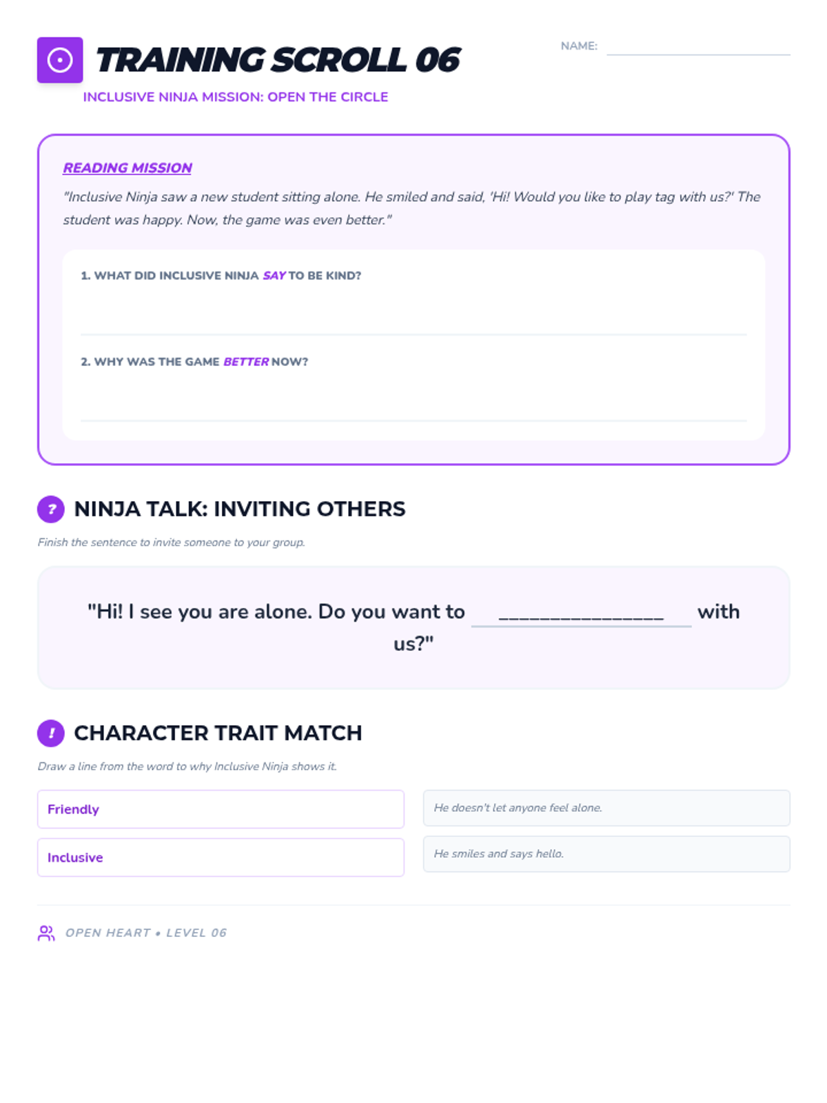 Facilitator script for Lesson 6, focusing on Inclusive Ninja. Includes a reading passage about inclusion, role-play scenarios, and a wrap-up circle activity. Revised for pacing and vocabulary.
