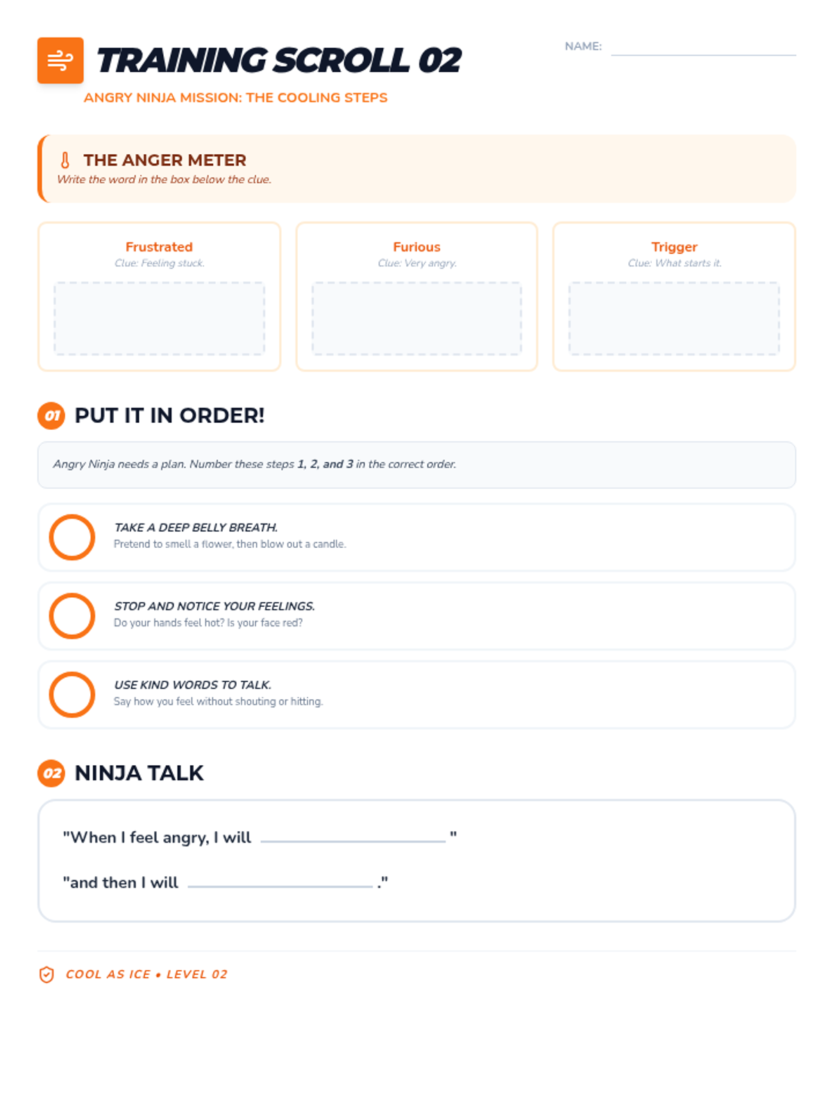 Student workbook page for Lesson 2 focusing on Angry Ninja. Features sequencing the calm-down steps, vocabulary writing, and sentence completion. Revised for handwriting space and single-page layout.