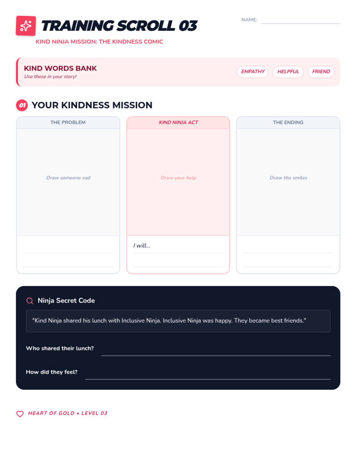 Student workbook page for Lesson 3 focusing on Kind Ninja. Includes comic sequencing and reading comprehension. Revised for contrast, writing space, and single-page layout.