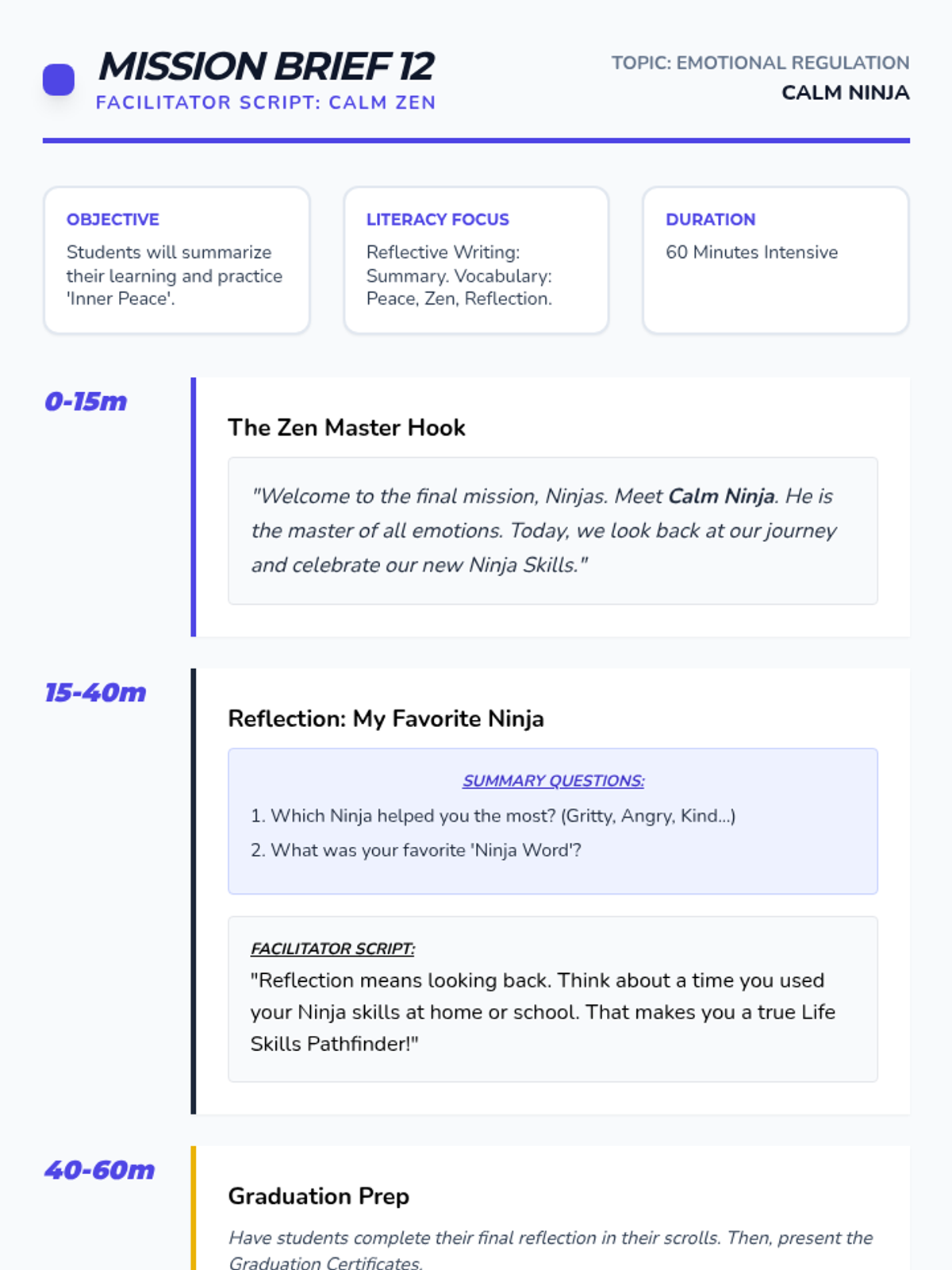 Facilitator script for Lesson 12, focusing on Calm Ninja. Summarizes the EQ journey and prepares students for graduation with reflective writing.