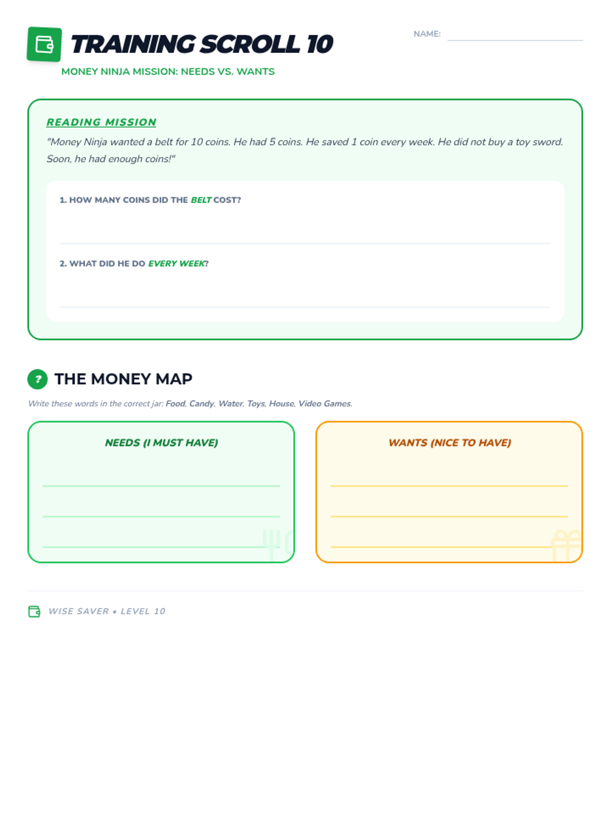 Student workbook page for Lesson 10 focusing on Money Ninja. Features 'Needs vs. Wants' sorting and reading comprehension for saving money. Revised for work area space.