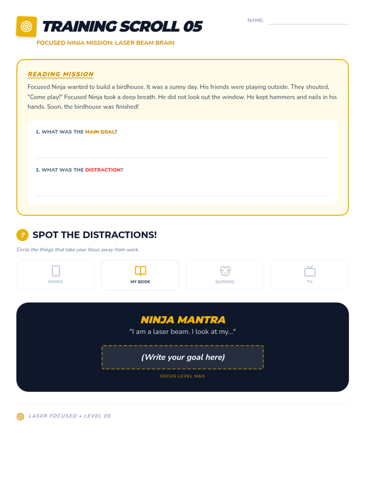 Student workbook page for Lesson 5 focusing on Focused Ninja. Features reading comprehension and a distraction activity. Revised for handwriting space and layout stability.