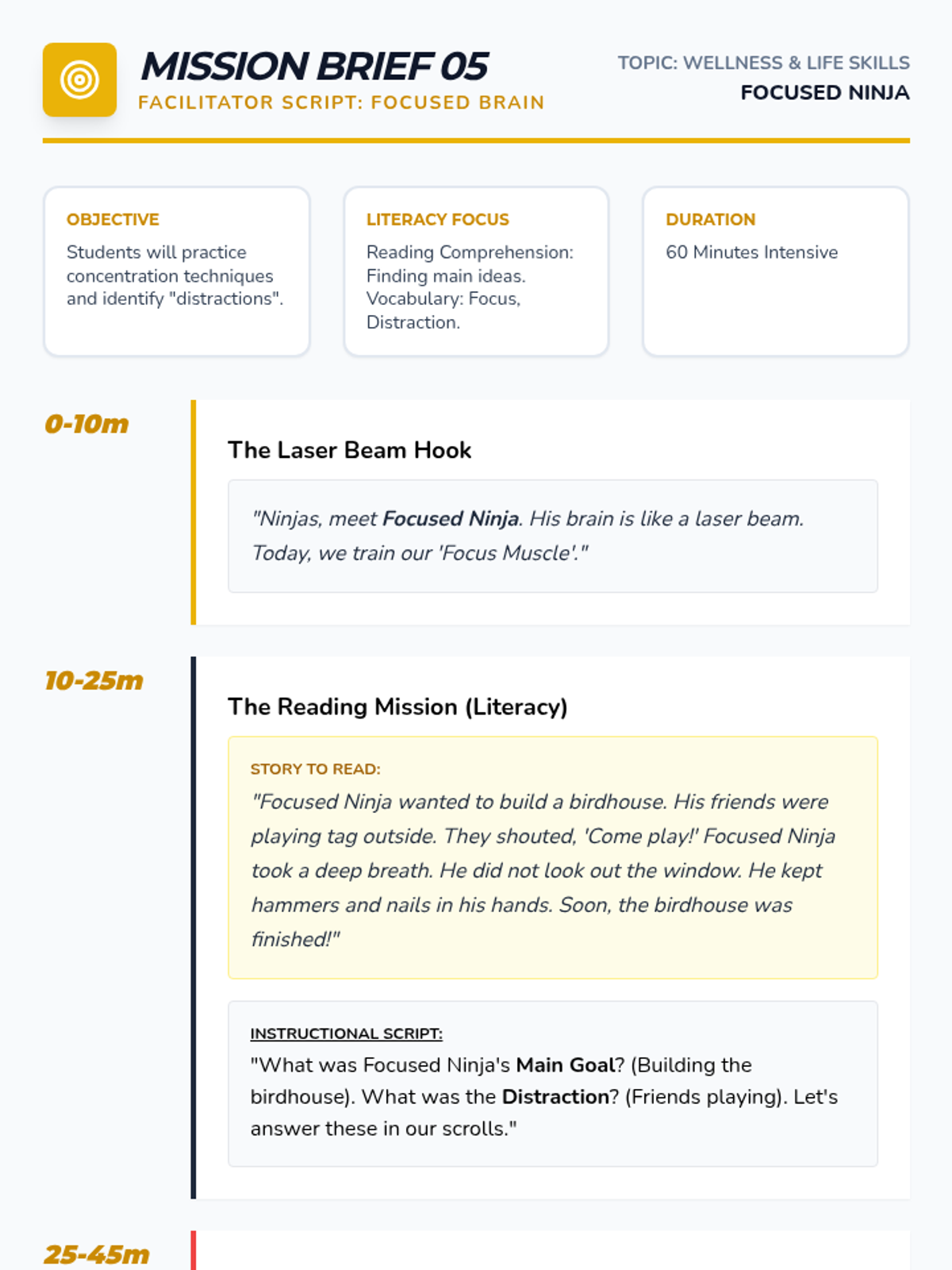 Facilitator script for Lesson 5, focusing on Focused Ninja. Teaches concentration and ignoring distractions. Revised for content completeness (story text added) and layout stability.