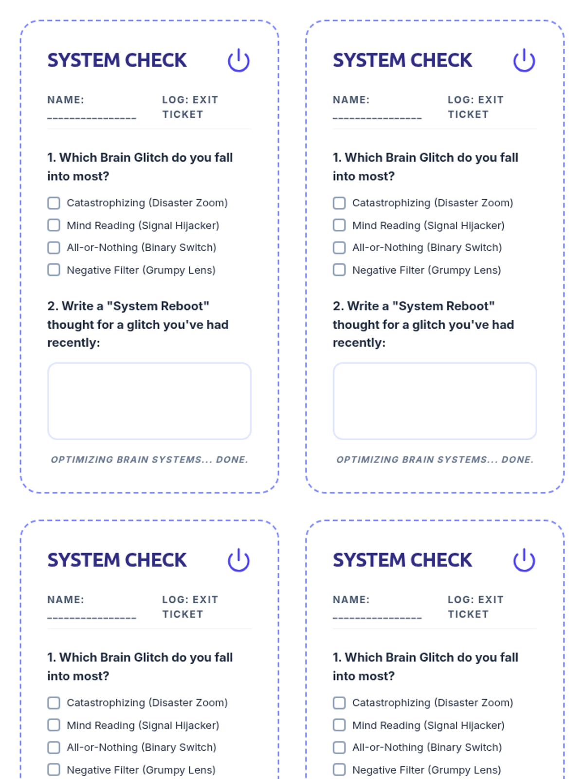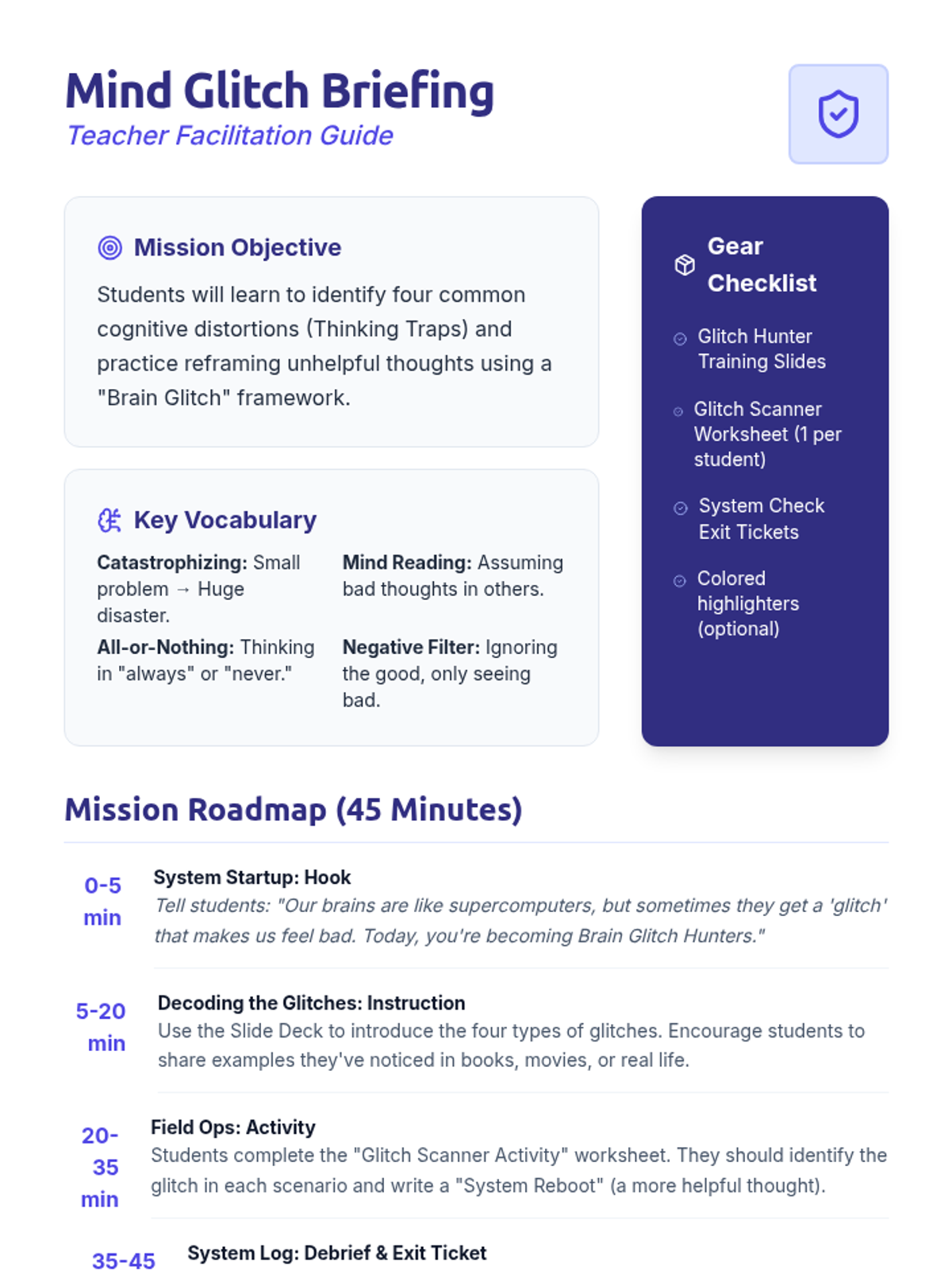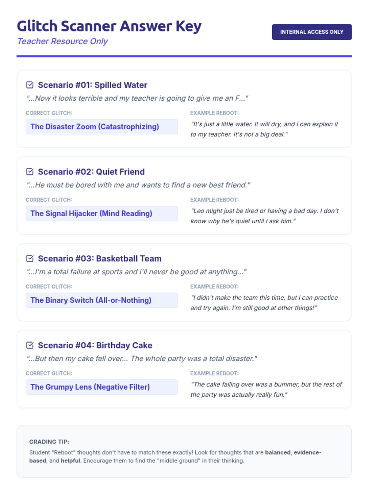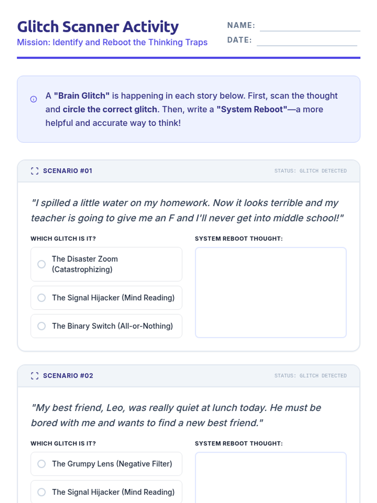 A set of 6 role-play scenario cards designed for 5th-grade boys. Each card includes a relatable social situation (roasting, sports, peer pressure, online toxicity, exclusion, and property boundaries) and a provided assertive script prompt. Each card is complete and actionable.