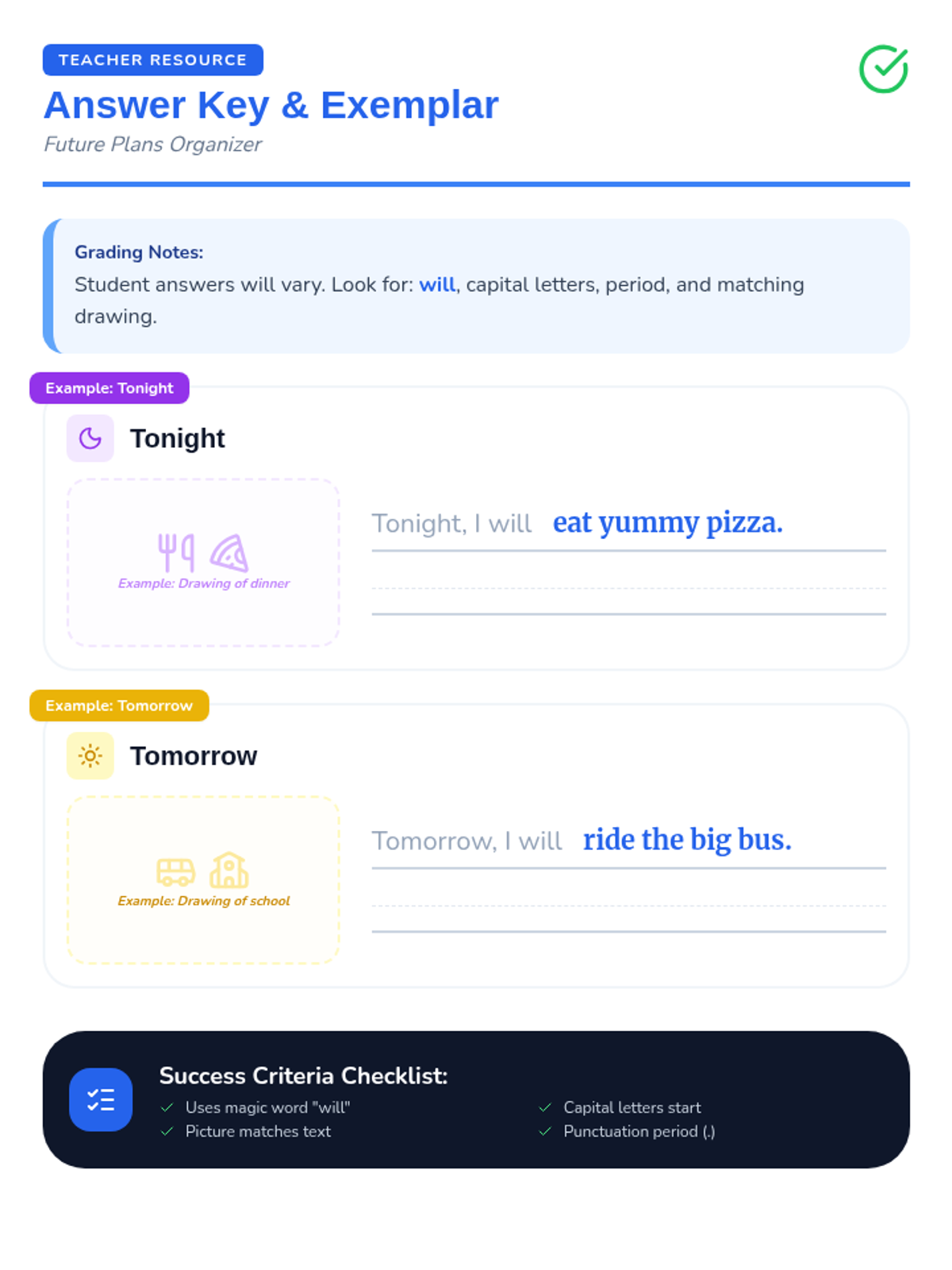 A teacher's answer key and exemplar for the Future Plans Organizer, providing sample student responses and a success criteria checklist.