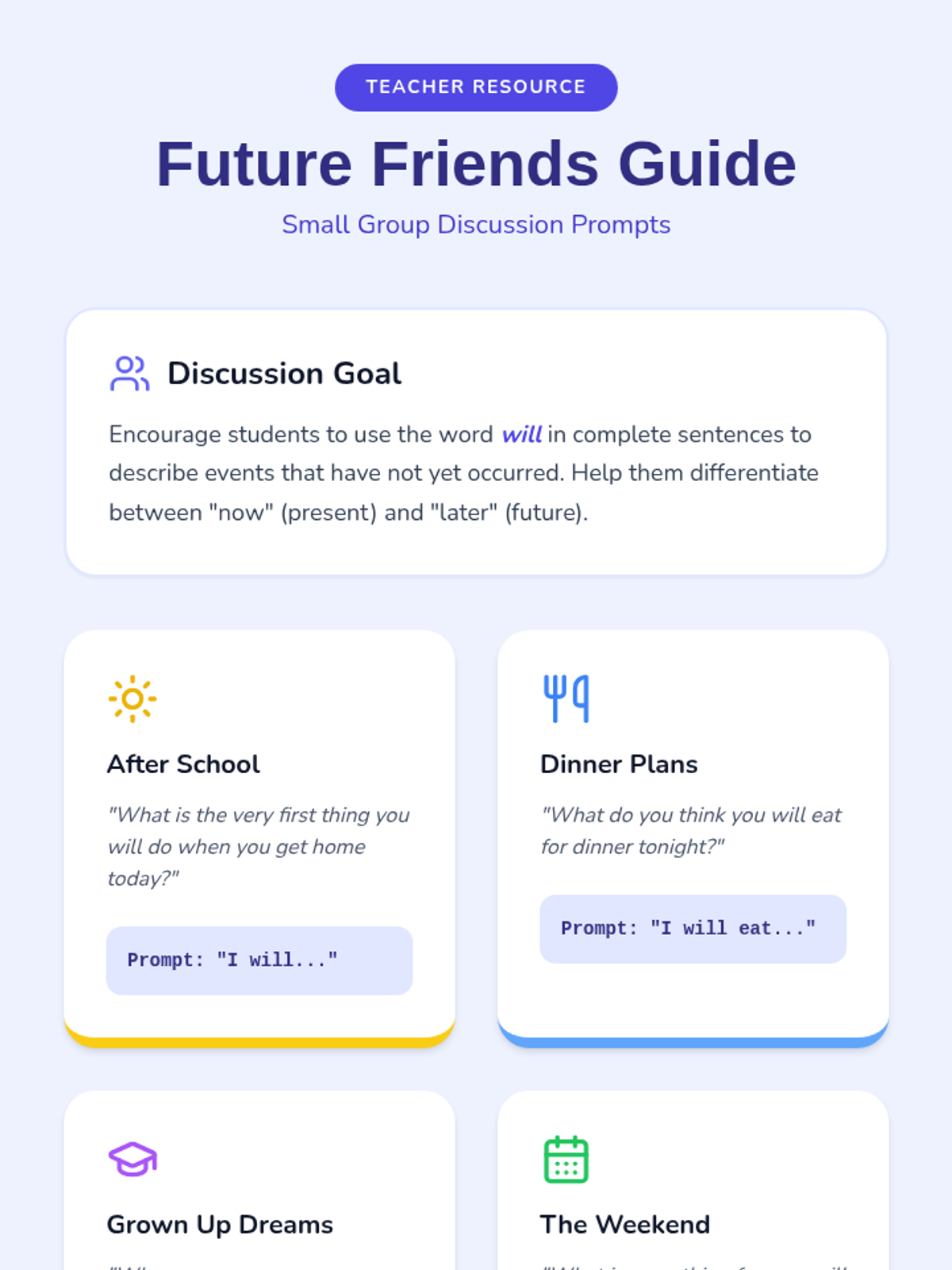 A teacher facilitation guide for small group discussions, featuring prompts and sentence starters to help 1st-grade students practice the future tense.