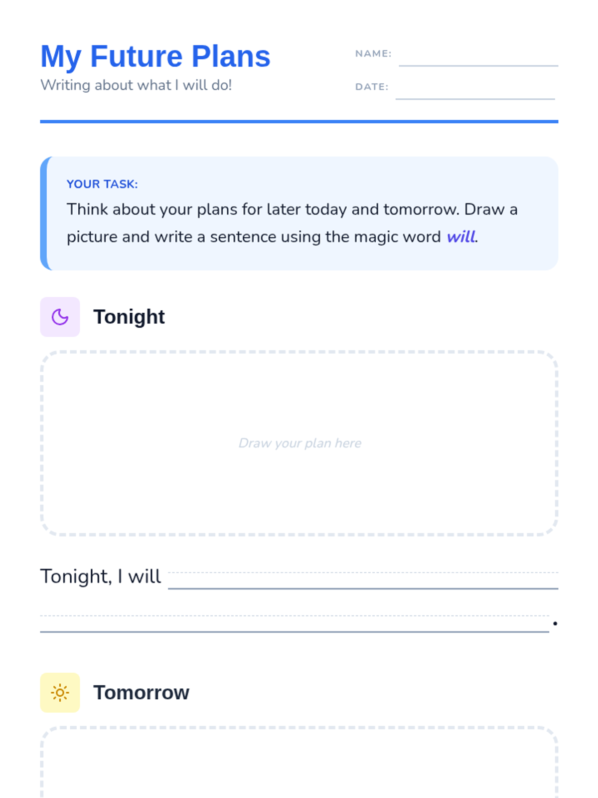 A student writing organizer for 1st graders to plan and illustrate their future activities for tonight and tomorrow, featuring sentence starters and a word bank.