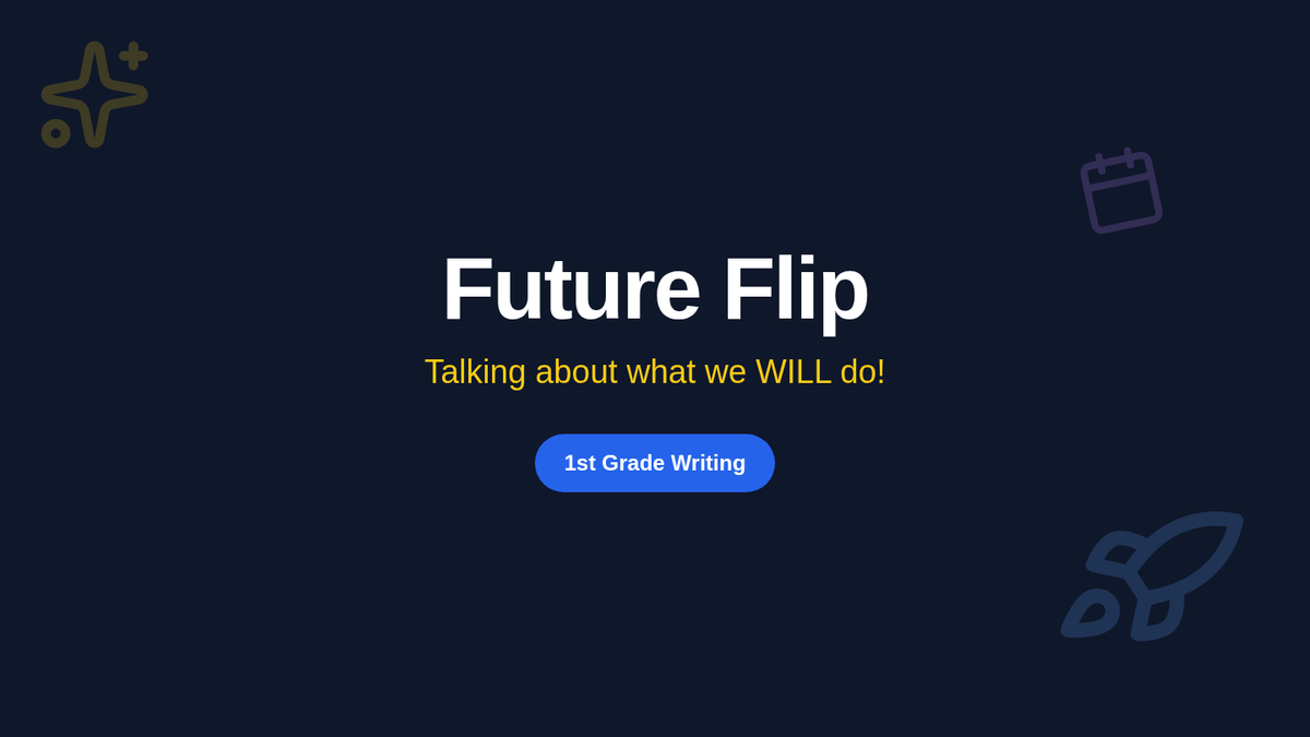 Engaging slides for a 1st-grade lesson on the future tense, introducing the word 'will' and practicing 'flipping' present tense sentences into future plans.