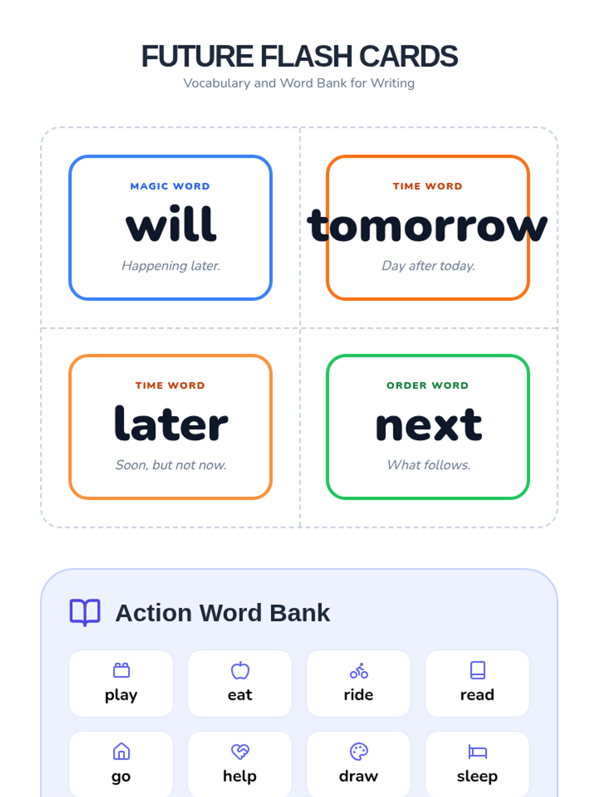 Flash cards for key future tense vocabulary and a visually supported word bank for 1st-grade writing activities.