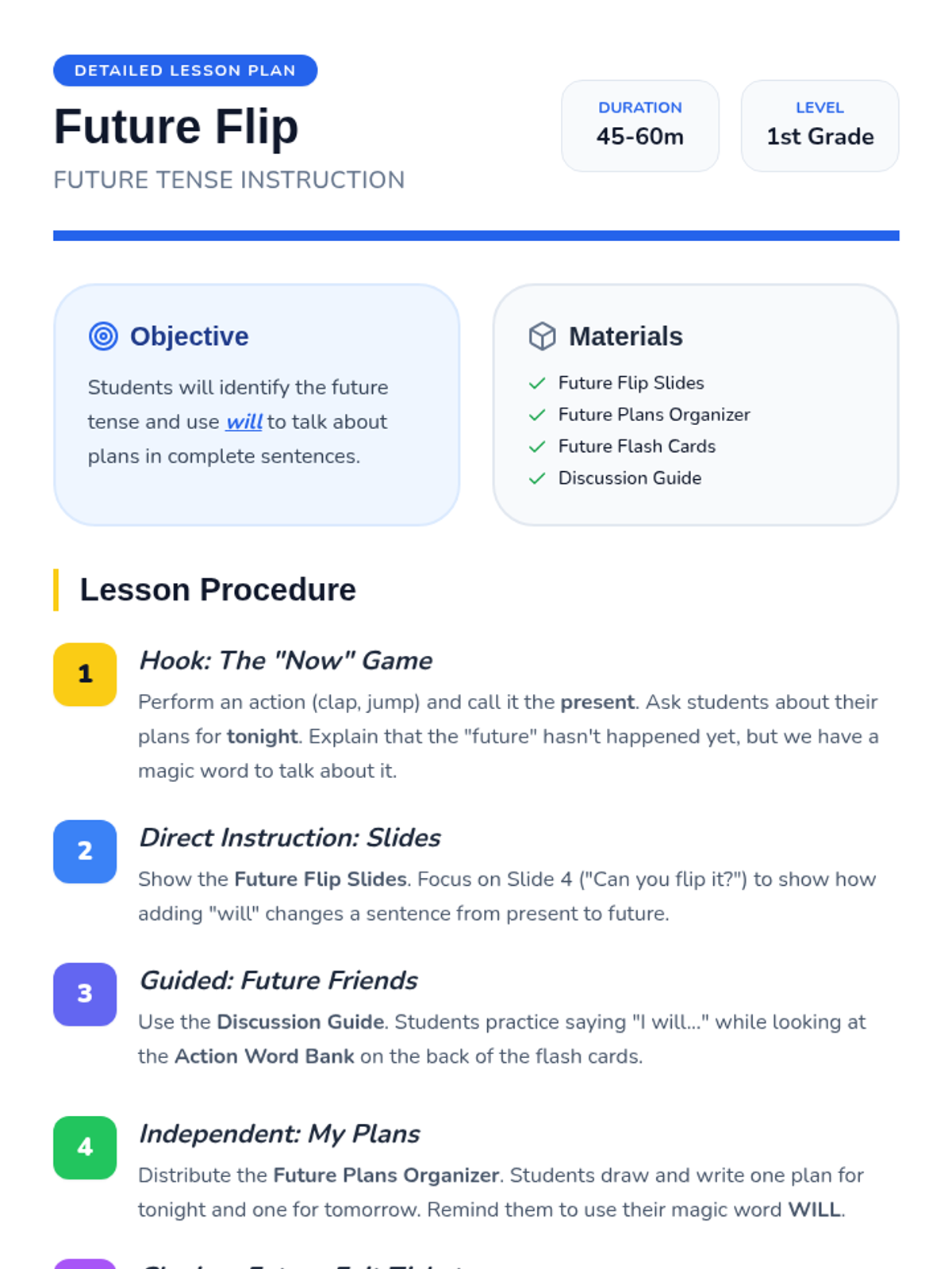 A comprehensive lesson plan for teachers to introduce the future tense using 'will', including a hook, guided practice, and differentiation strategies.