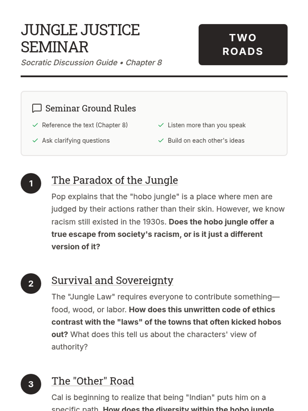 A discussion guide for a Socratic Seminar on Chapter 8 of 'Two Roads', exploring themes of racism, community laws, and identity.