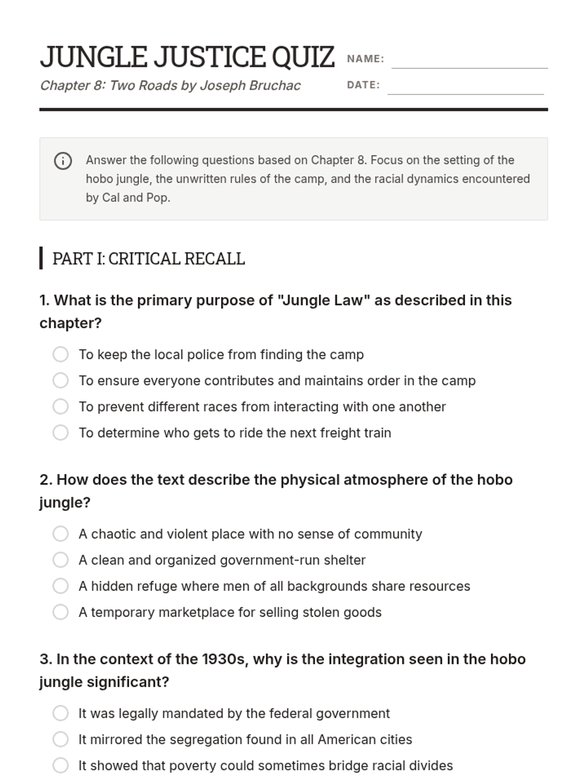A reading comprehension quiz for Chapter 8 of 'Two Roads', focusing on the setting of the hobo jungle and themes of racism and community.
