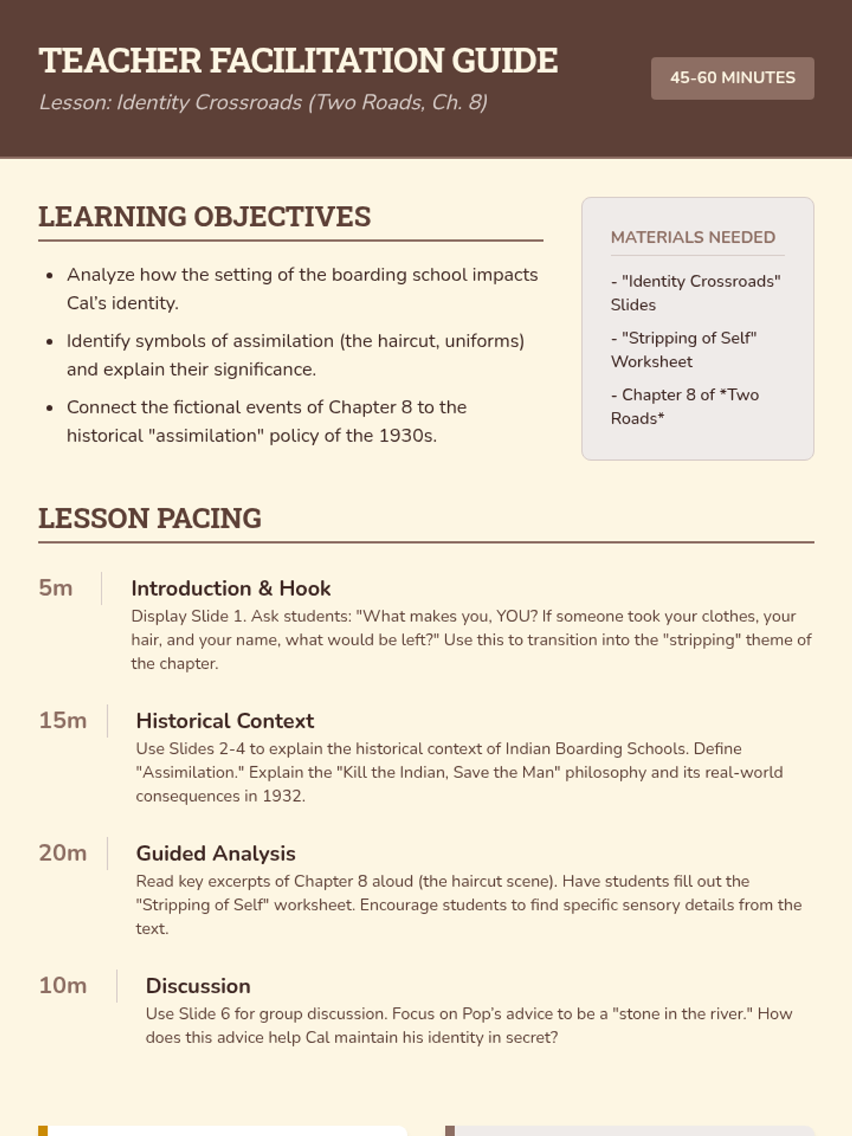 A comprehensive teacher guide for facilitating the 'Identity Crossroads' lesson. Includes learning objectives, pacing, discussion prompts, and differentiation strategies. Revised for better page layout and content density.