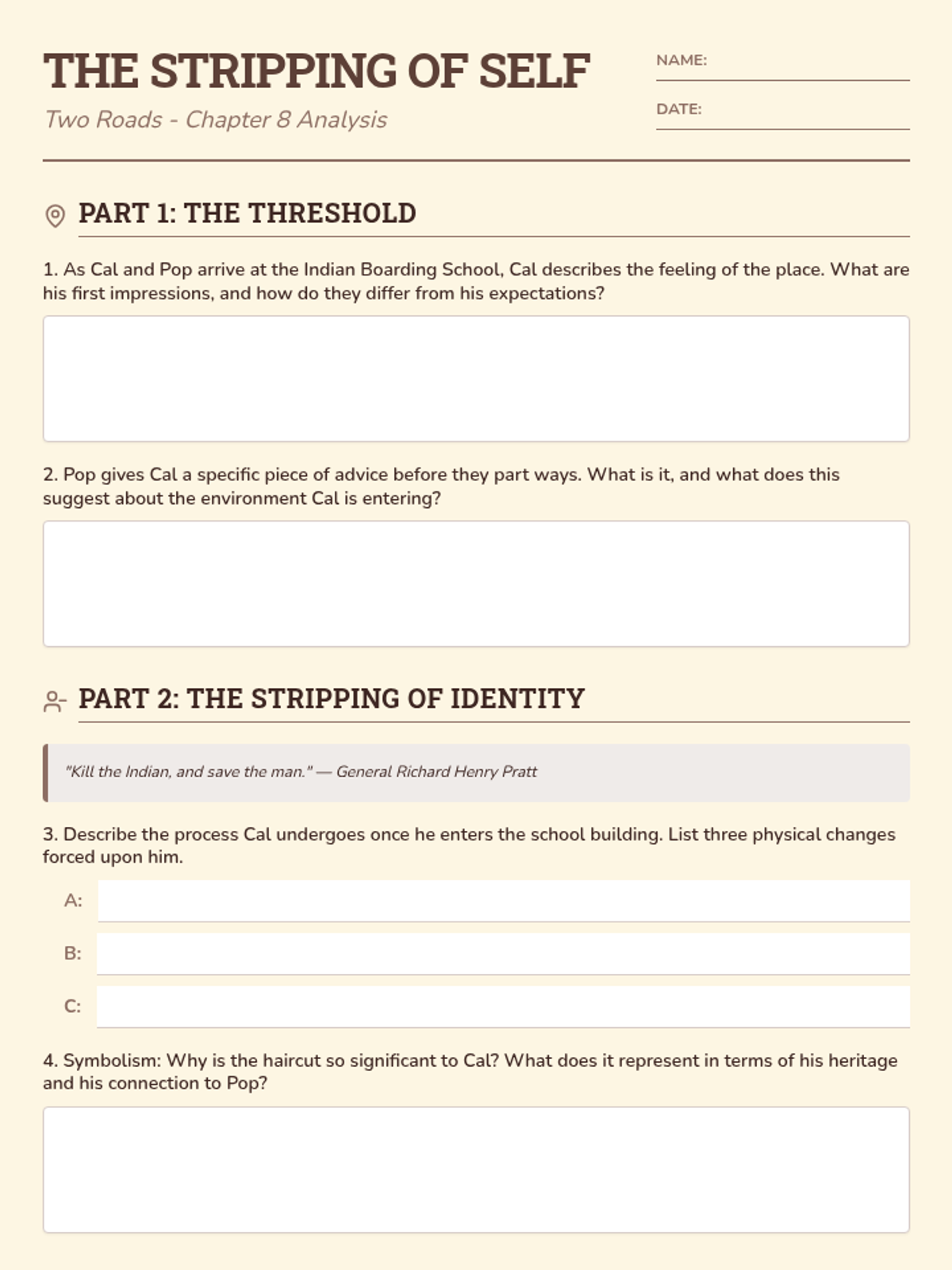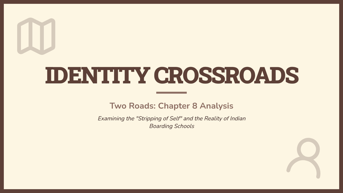 A presentation for Chapter 8 of 'Two Roads,' exploring the historical context of Indian Boarding Schools, the symbolic significance of the haircut, and Cal's identity transition. Includes discussion prompts and visual analysis.