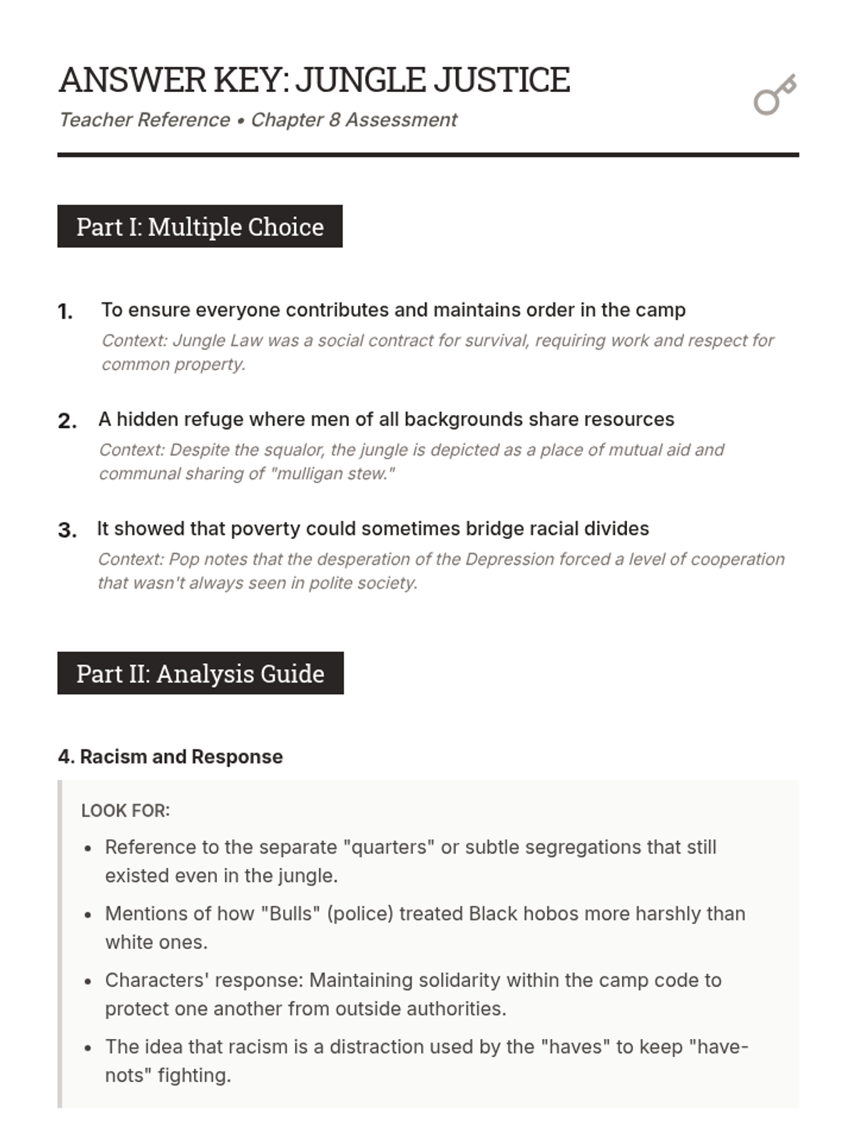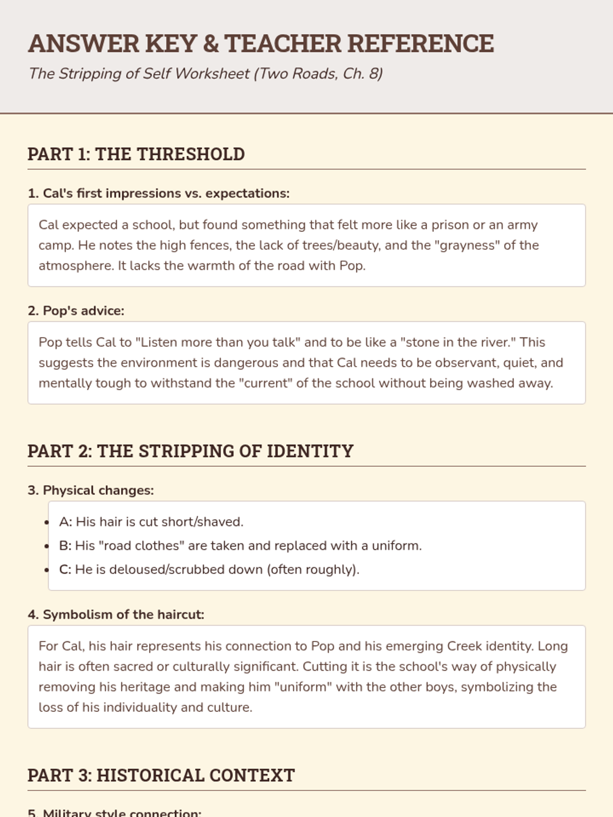An answer key for the Chapter 8 worksheet, providing suggested responses and instructional guidance for analyzing identity and historical context in 'Two Roads'.