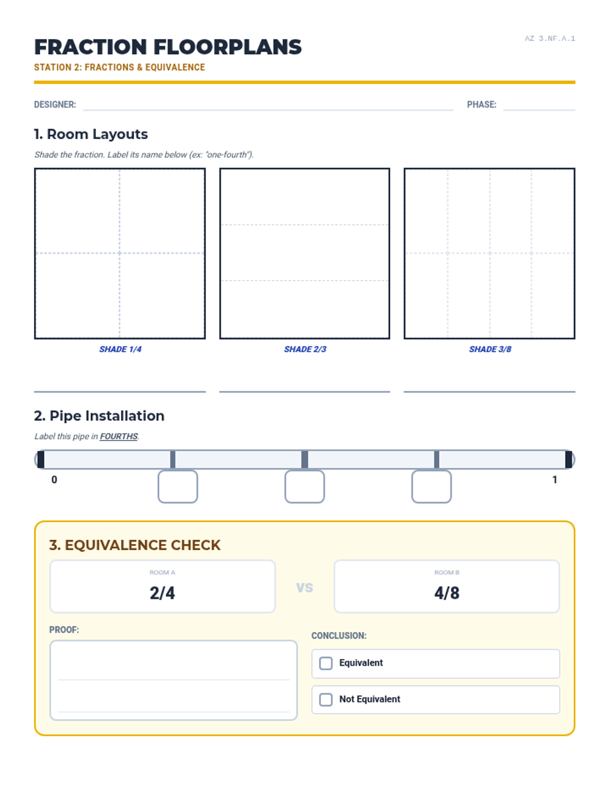 A hands-on fraction activity where students shade floorplans, label fraction number lines, and use manipulatives to compare fractional room sizes for equivalence.
