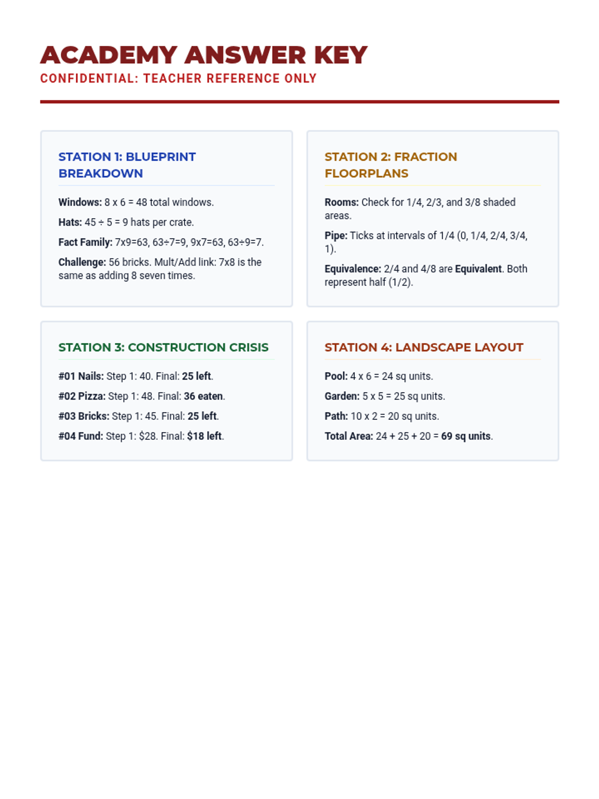 The master answer key for all four centers in the Architect Academy rotation, providing equations and final solutions for teacher use.
