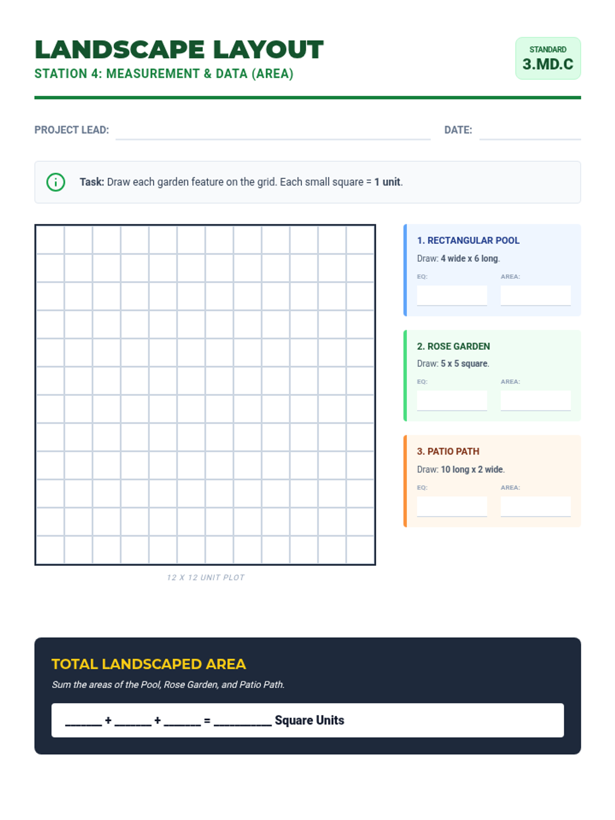 A landscape design activity where students use a grid to draw rectangular and square features (pool, garden, path) and calculate their area using multiplication.