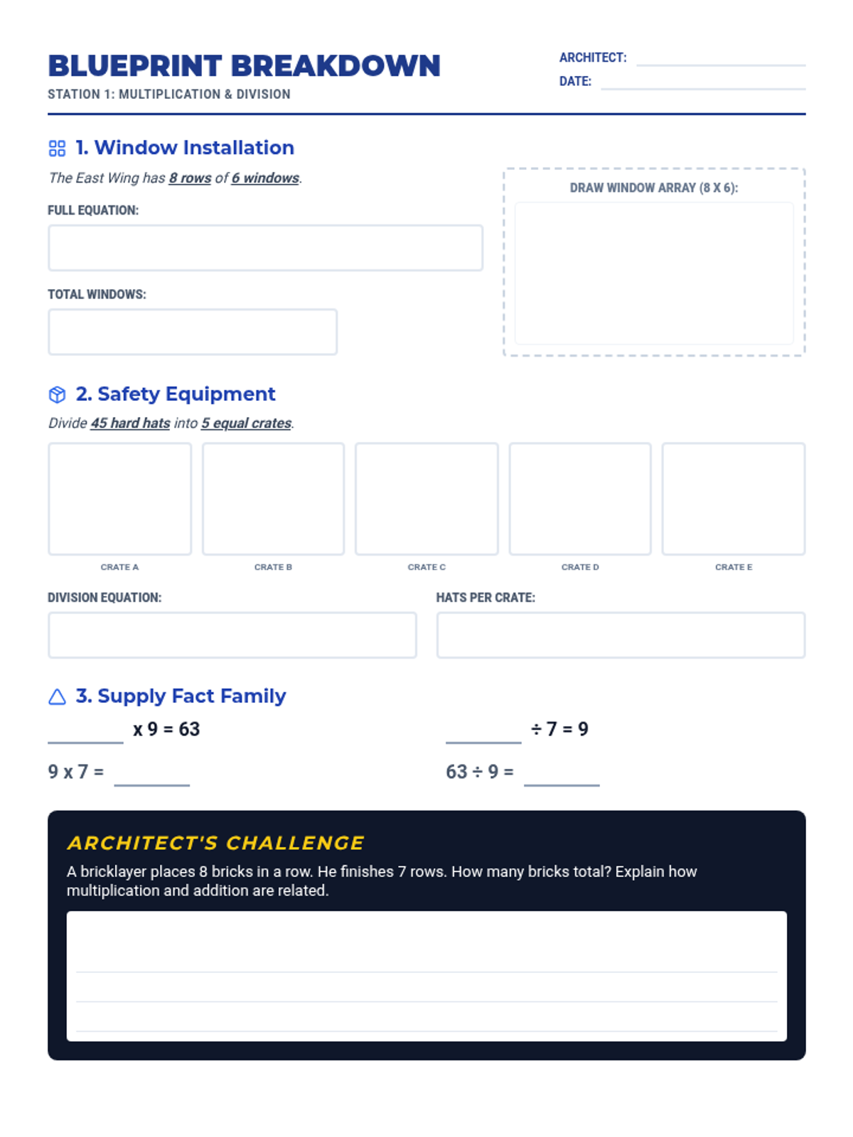 A multiplication and division worksheet themed around construction tasks like window installation and equipment organization. Includes arrays, equal groups, and fact families.