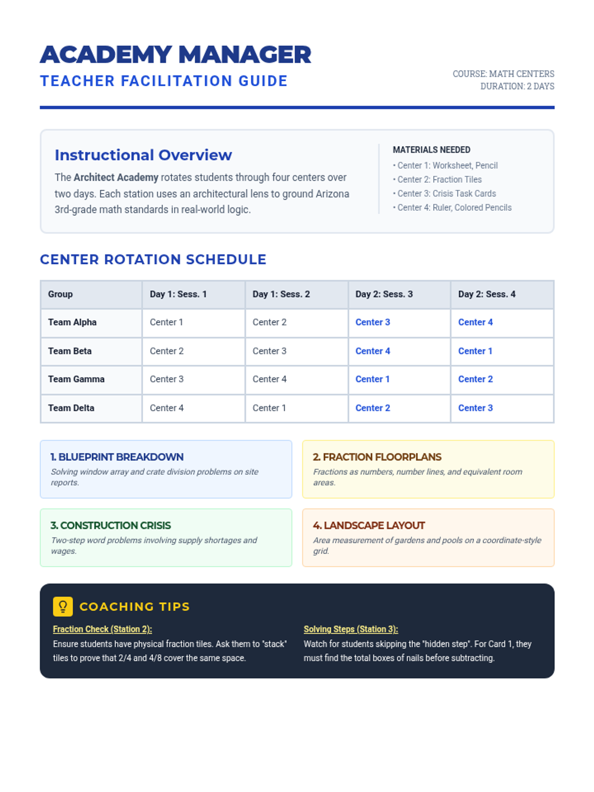 A comprehensive teacher's guide for managing the two-day Architect Academy math center rotation, including standards alignment, schedule, and coaching tips.