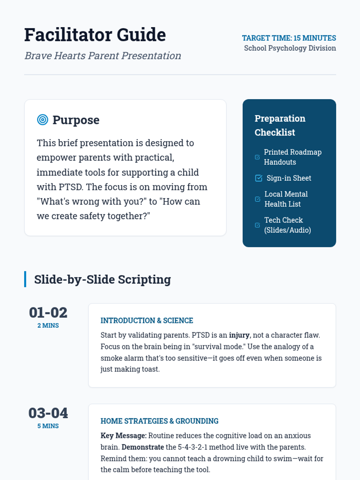 A facilitator guide for school psychologists delivering the 'Brave Hearts' PTSD presentation to parents. Includes a pacing guide, slide-by-slide script notes, and preparation checklists.